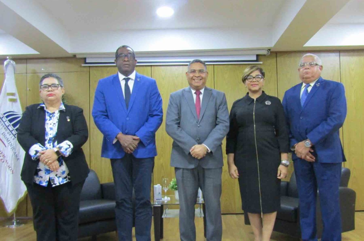 Al centro, la máxima autoridad del Ministerio de Economía, Alexis Cruz. De izquierda a derecha, la tesorera de la UASD, Edita Rodríguez Salce; el decano de la Facultad de Ciencias Económicas y Sociales de esta casa de estudios, Antonio Ciriaco; la viceministra de Cooperación Internacional, Olaya Dotel y el director del Centro de Capacitación e Inversión Pública (CCPIP), Bernardo Hirán Sánchez Melo.