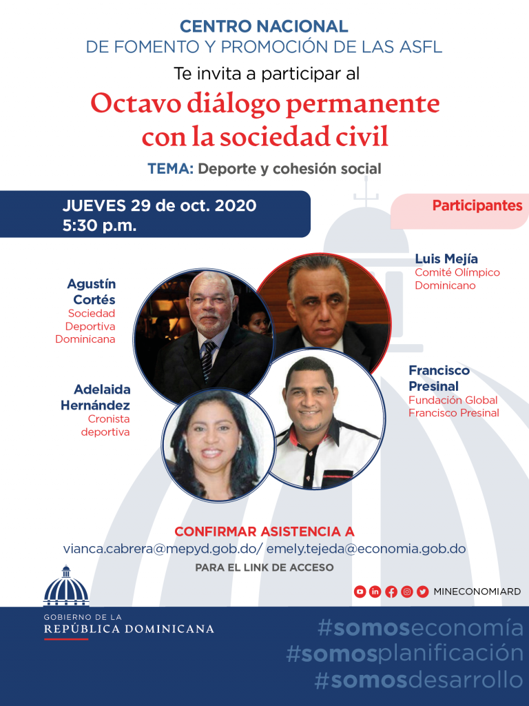 Santo Domingo, República Dominicana (26 de octubre de 2020). El Centro de Fomento y Promoción de las Asociaciones sin Fines de Lucro realizará este jueves 29 de octubre a las 5:30 de la tarde el Octavo Diálogo Permanente con la Sociedad Civil titulado “Deporte y Cohesión Social”.