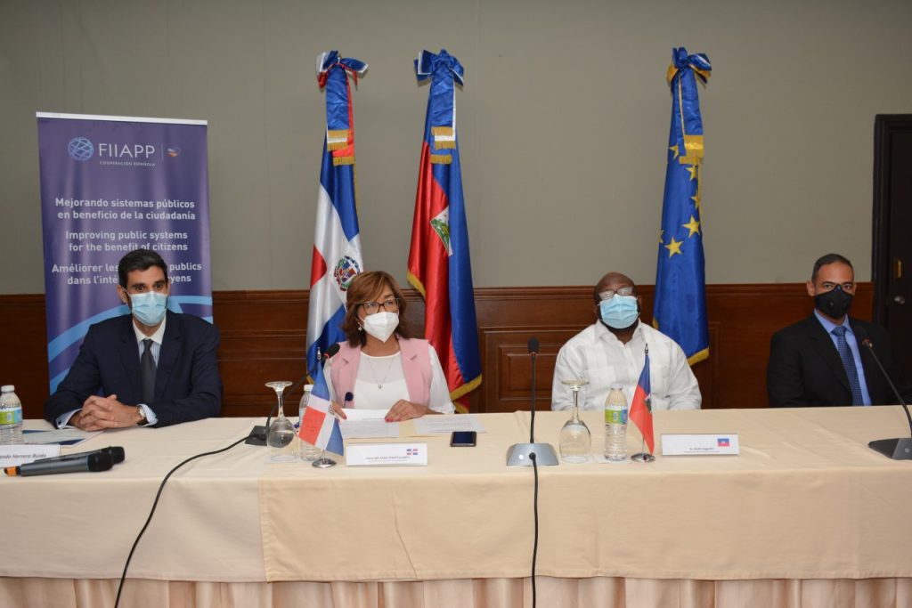 De izquierda a derecha, Fernando Herrero Ruido, jefe de equipo del Proyecto por parte de la Fundación Internacional e Iberoamericana en materia de Administración y Políticas Púbicas (FIIAPP); Olaya Dotel, viceministra de Cooperación Internacional del Ministerio de Economía, Planificación y Desarrollo y Ordenadora Nacional de los Fondos Europeos para el Desarrollo, Olaya Dotel; el embajador de Haití en la República Dominicana, Smith Augustin; y el coronel Héctor de Jesús Ovalles Hernández, director de la Escuela del Departamento Nacional de Investigaciones (DNI).