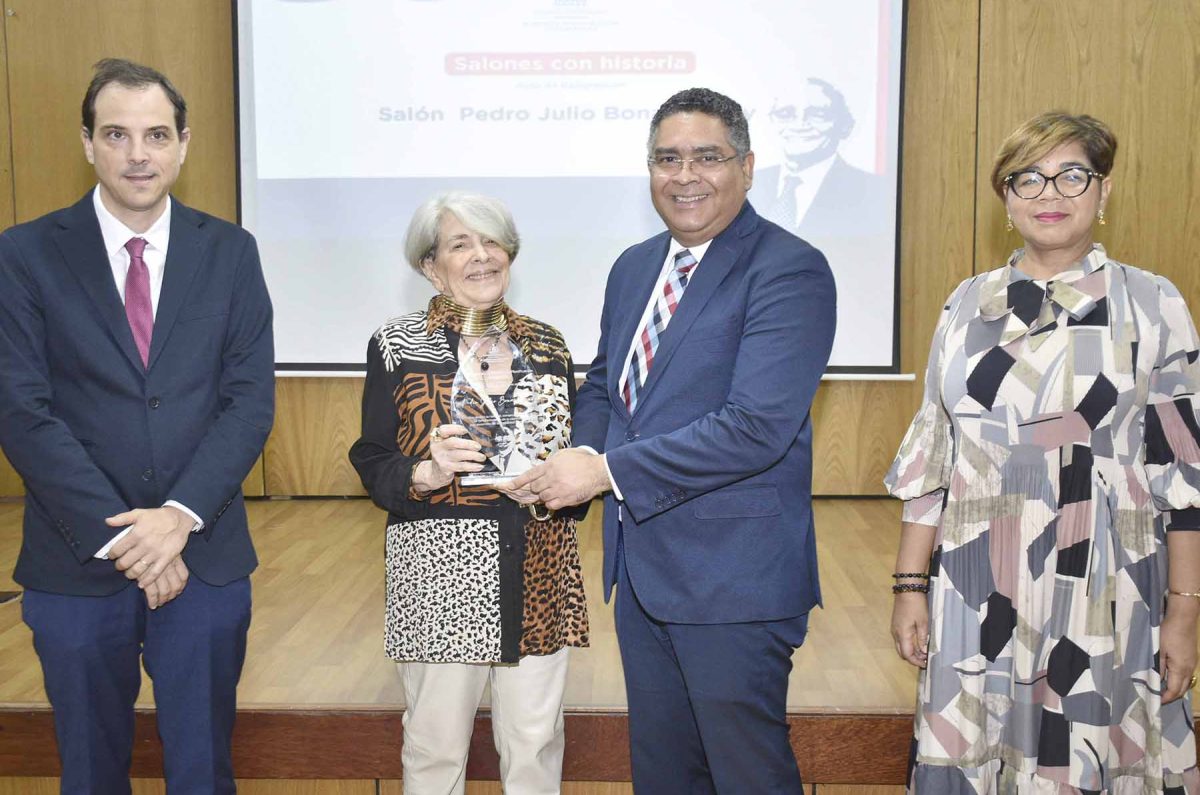 Al centro, la máxima autoridad del Ministerio de Economía, Planificación y Desarrollo, Alexis Cruz Rodríguez, realiza entrega de placa de reconocimiento a Grethel Castellanos, en representación de la familia del ingeniero Pedro Julio Bona Prandy, le acompañan Martín Francos, viceministro de Planificación e Inversión Pública, y Olaya Dotel, viceministra de Cooperación Internacional del Ministerio de Economía