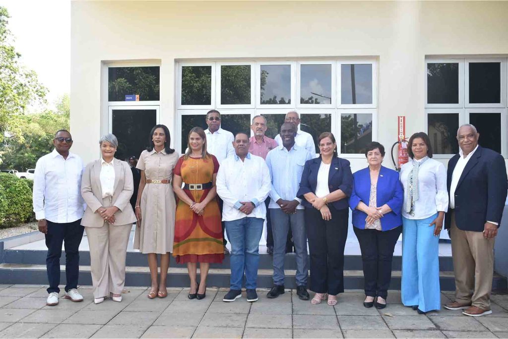 Al centro, Yamel Valera Castillo, viceministro Administrativo y Financiero del Ministerio de Economía, Planificación y Desarrollo, le acompañan las gobernadoras Ivelisse Mercedes de La Romana, Magaly Tabar de Goico de El Seibo, Martina Pepén, de La Altagracia, Yovanny Baltazar de San Pedro de Macorís, Maribel Simón de Hato Mayor, y Rafaela Gomera de Monte Plata, así como Eduardo Familia, alcalde de Villa Hermosa y los representantes de la Oficina Regional de Planificación de la región Yuma e Higuamo.