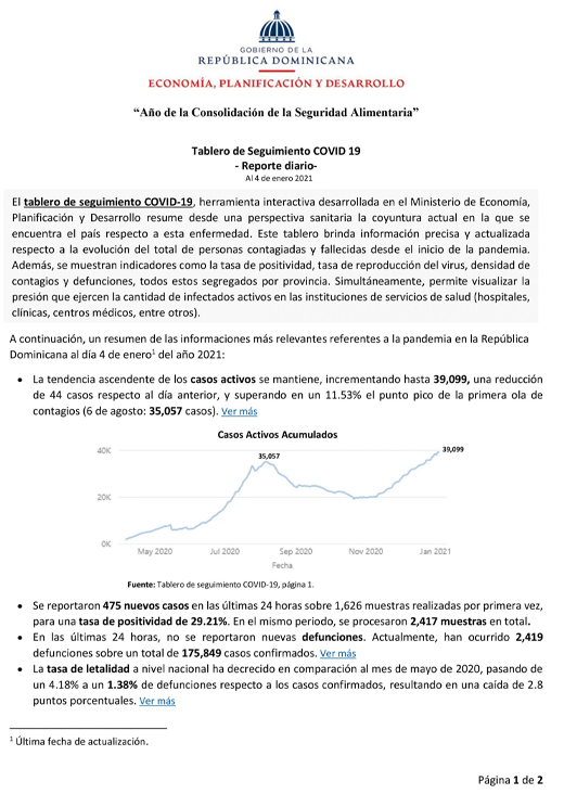 Tablero de Seguimiento COVID 19 – Reporte diario – Al 4 de enero 2021