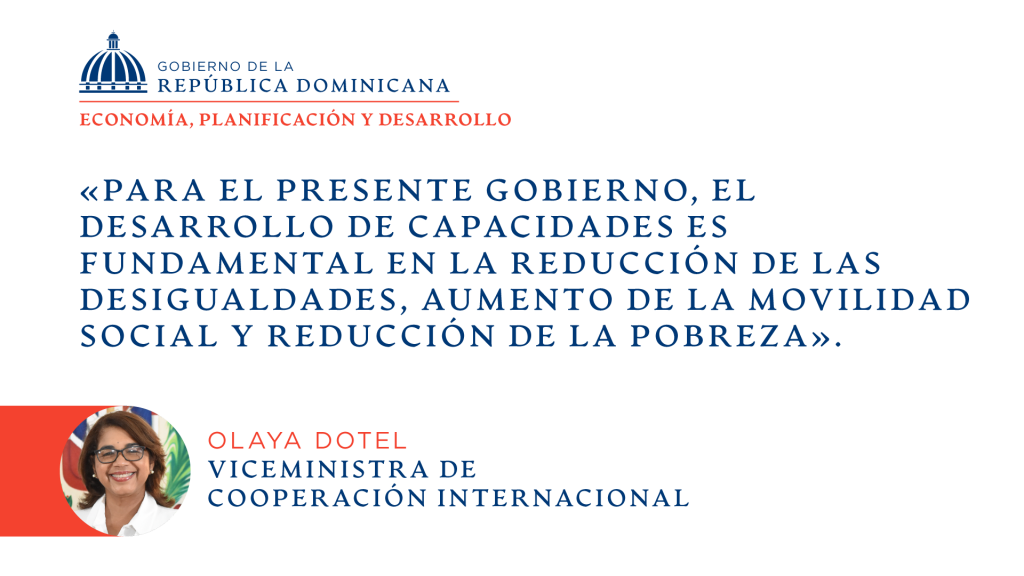 La viceministra de Cooperación Internacional del Ministerio de Economía, Planificación y Desarrollo, Olaya Dotel, señaló que, para la presente gestión gubernamental, el desarrollo de capacidades es un pilar fundamental en la reducción de las desigualdades, aumento de la movilidad social y reducción de la pobreza.