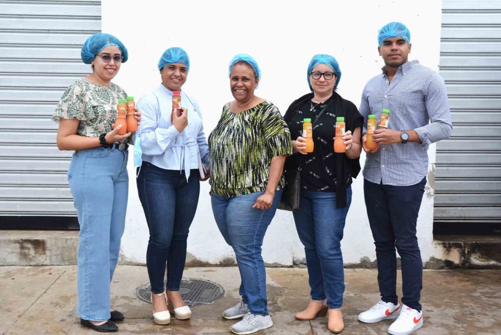 Desde la izquierda, Eliana Lantigua, técnica de calidad, Universidad ISA, Yuridy Bourdierd, coordinadora de proyecto FORMIFRUT, Universidad ISA, María Magdalena Marte, socia-propietaria de Fruit Paradise, Verónica Muñiz, analista de cooperación internacional, Moisés Gómez, técnico de cooperación internacional