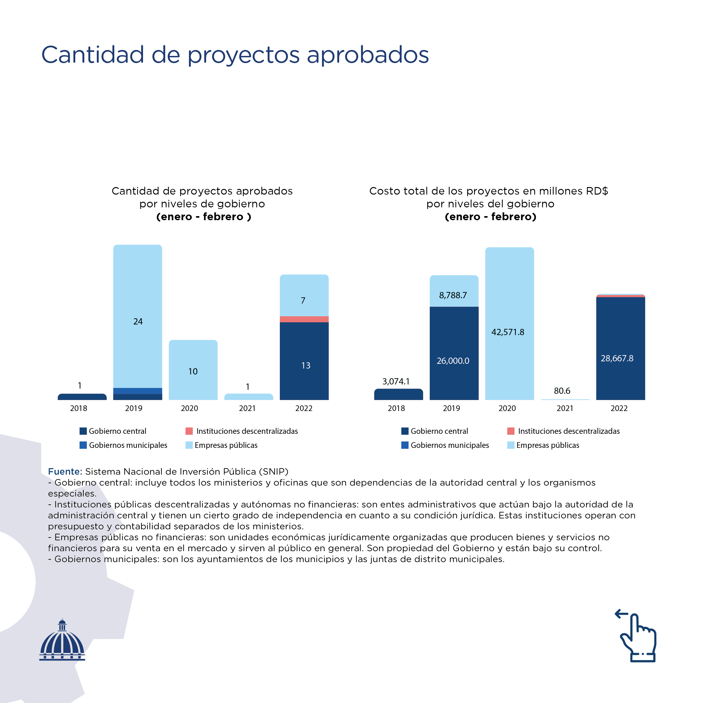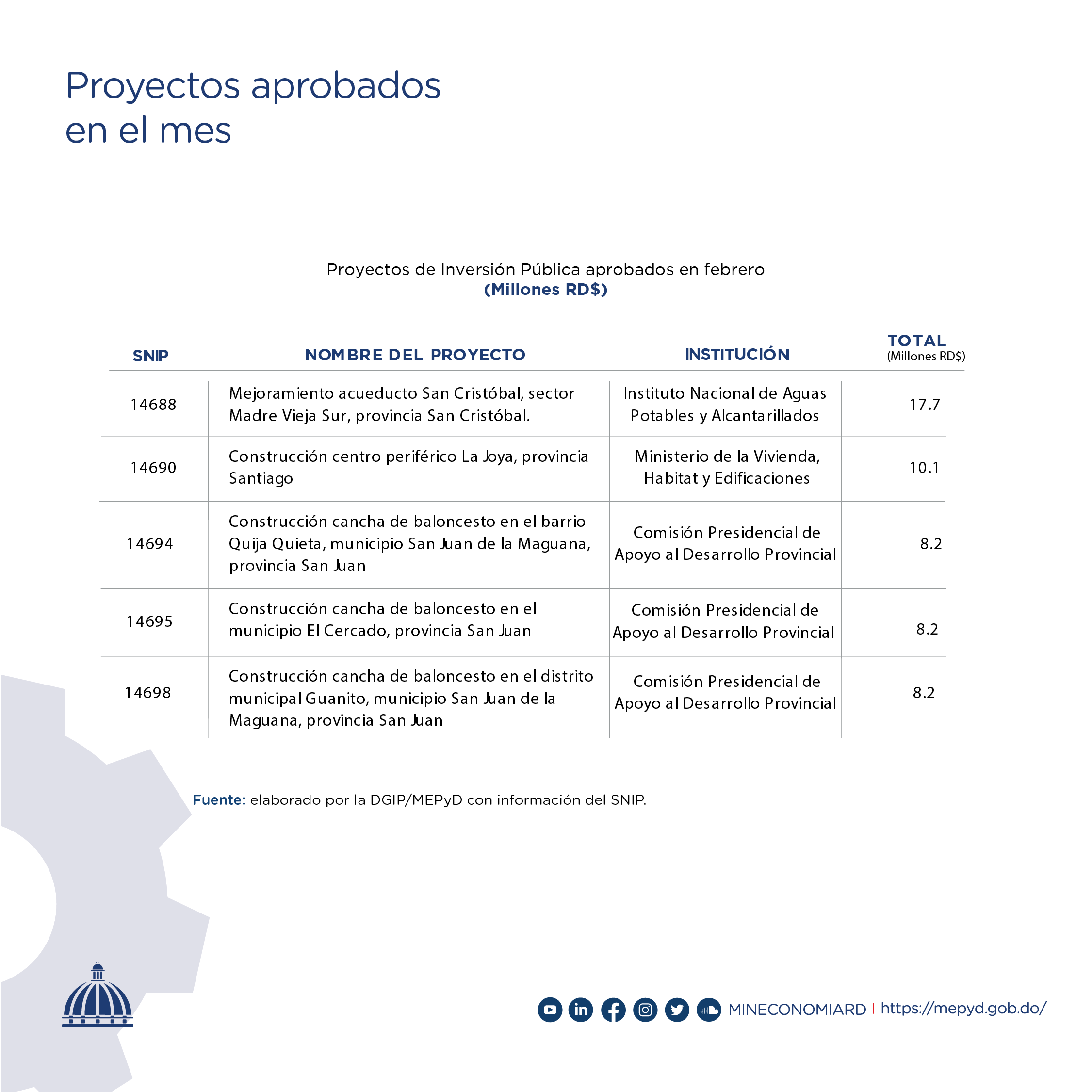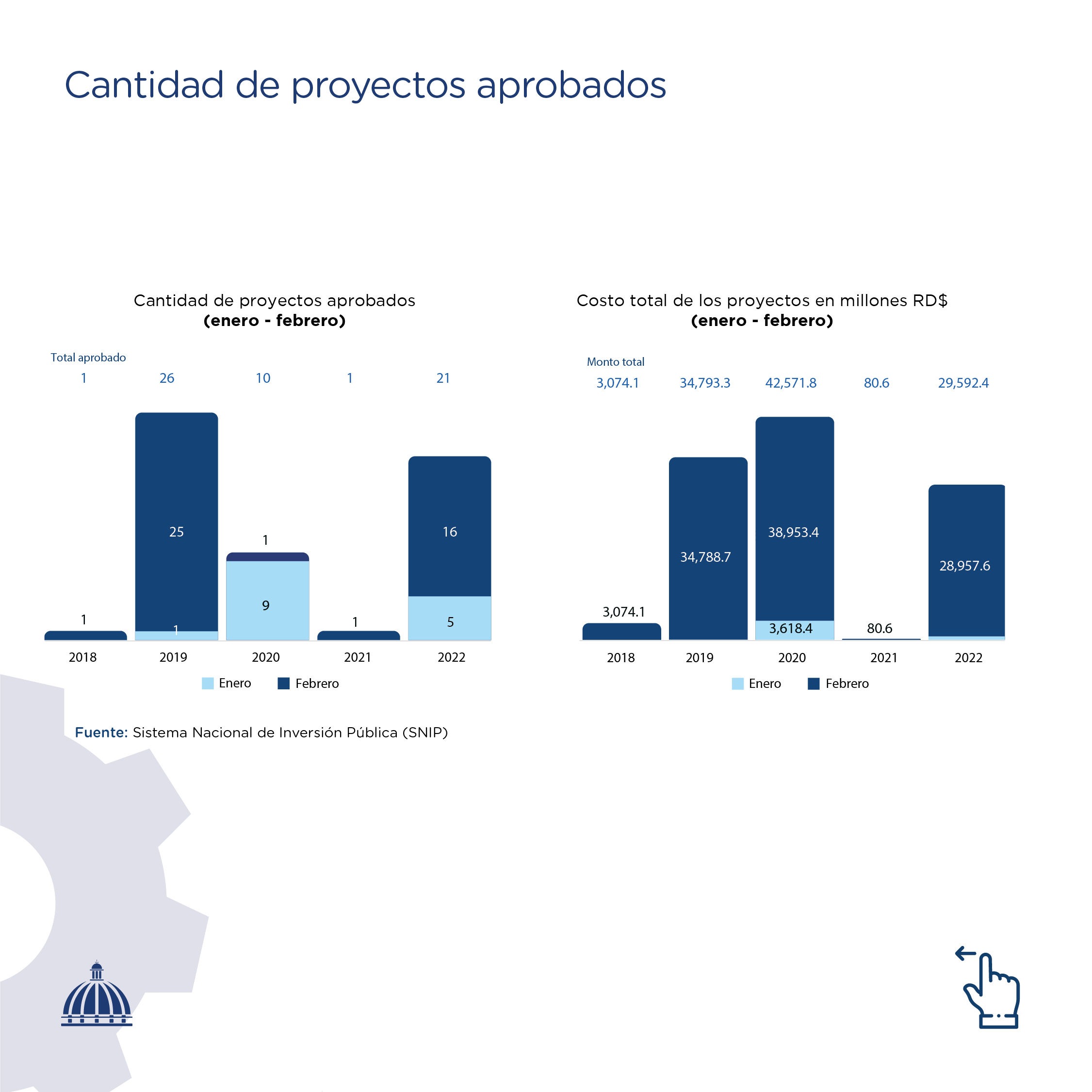 Santo Domingo, República Dominicana. (Marzo de 2022). El Ministerio de Economía, Planificación y Desarrollo informa que en febrero de 2022 fueron aprobados 16 proyectos de inversión pública para un total acumulado de 21 entre enero-febrero.