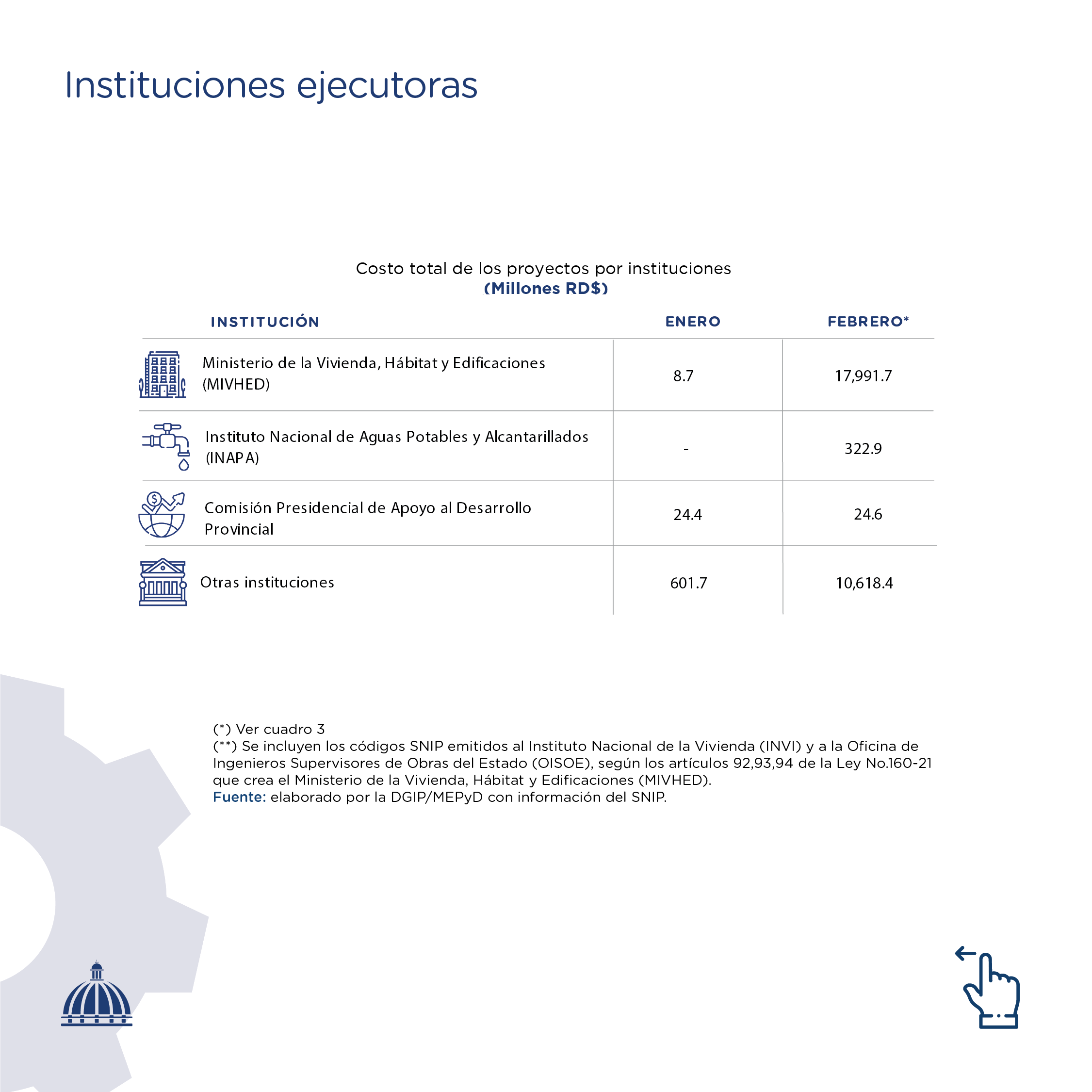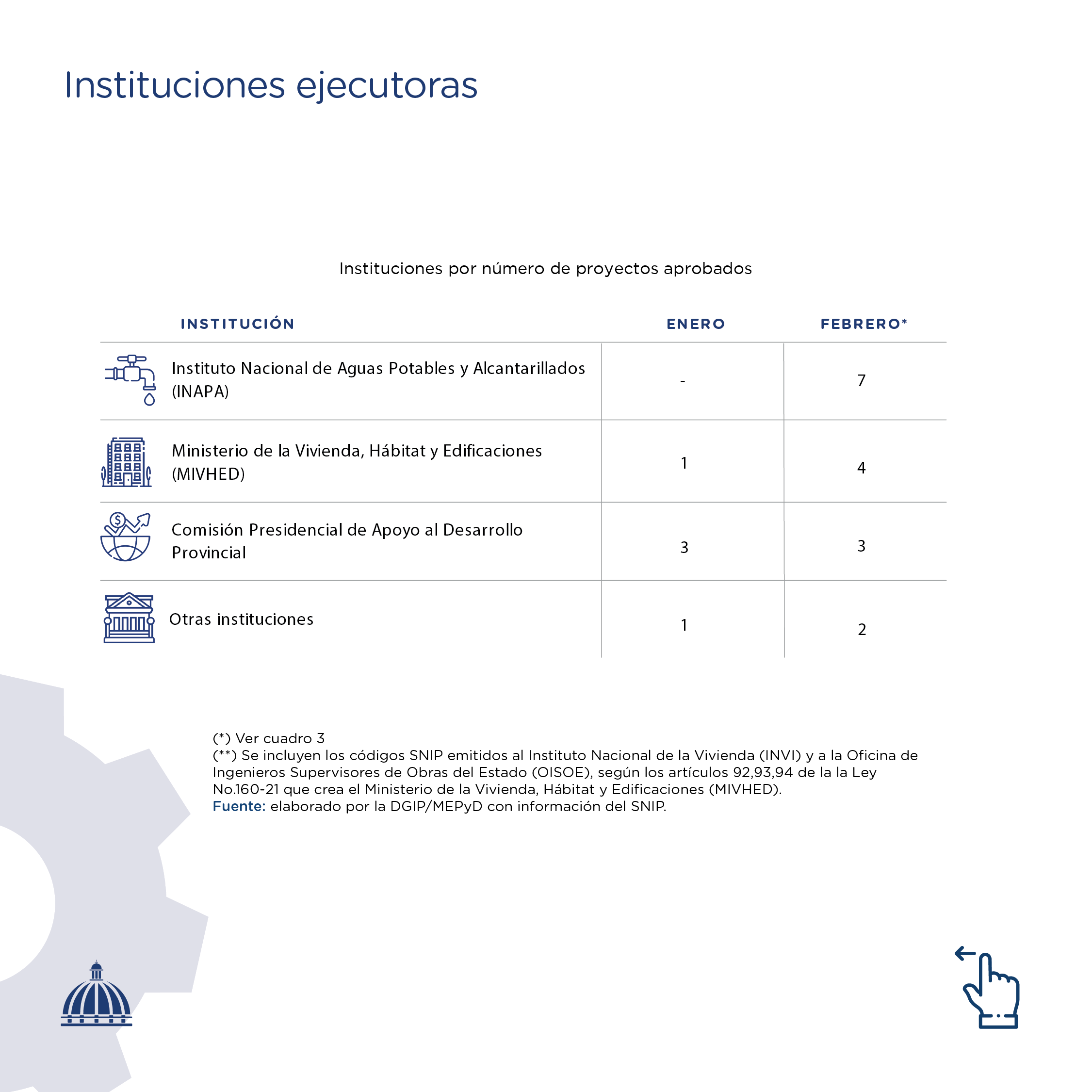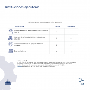 Entre las instituciones ejecutoras de los proyectos, se encuentra el Instituto Nacional de Aguas Potables y Alcantarillados (INAPA), con siete; el Ministerio de la Vivienda, Hábitat y Edificaciones (MIVHED) con cuatro, la Comisión Presidencial de Apoyo al Desarrollo Provincial con tres y otras con dos.