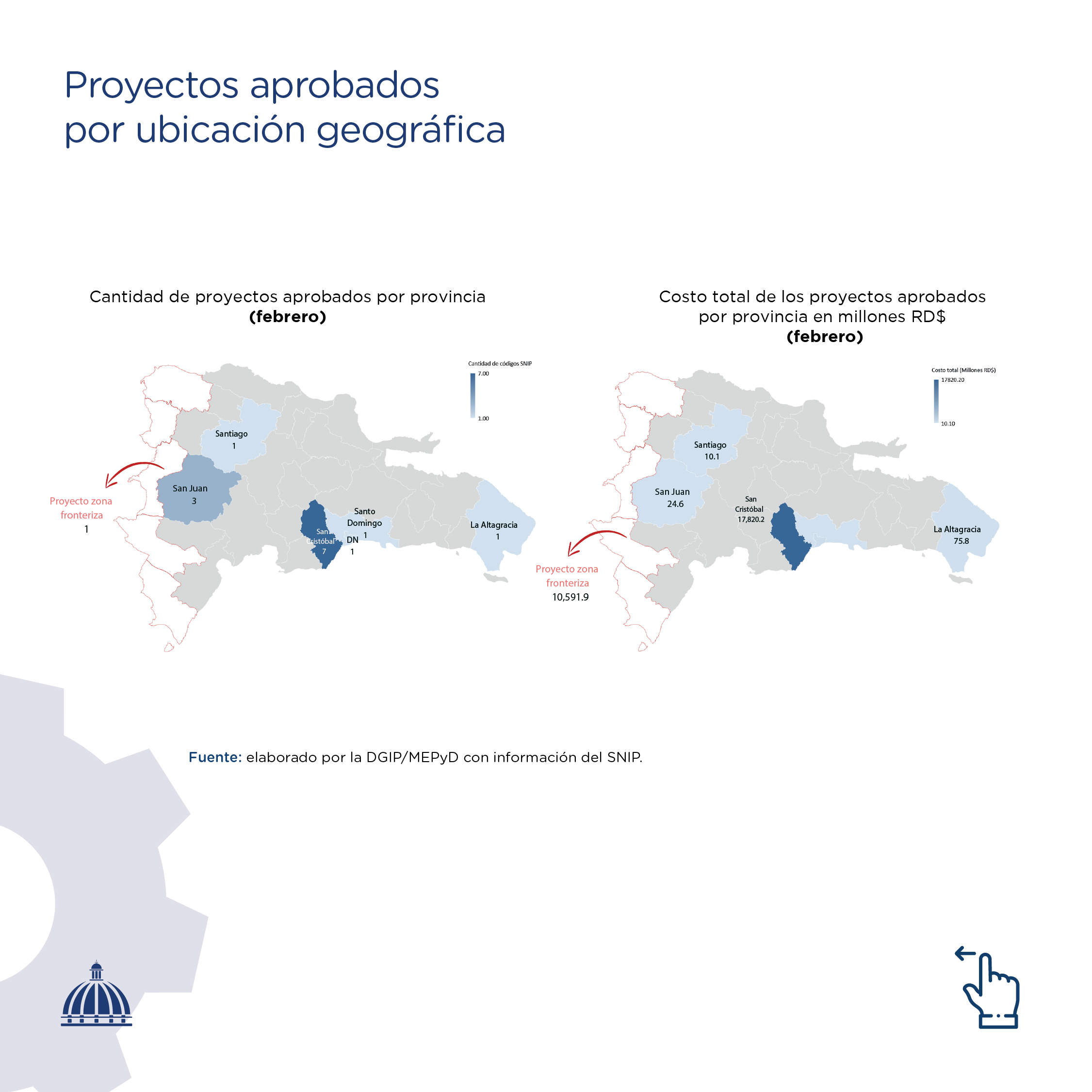 El informe puntualiza que de los 16 proyectos aprobados en febrero, siete fueron en la provincia San Cristóbal, tres en San Juan y el restante se encuentra distribuido entre Santo Domingo, Santiago, La Altagracia y uno con influencia en toda la zona fronteriza.