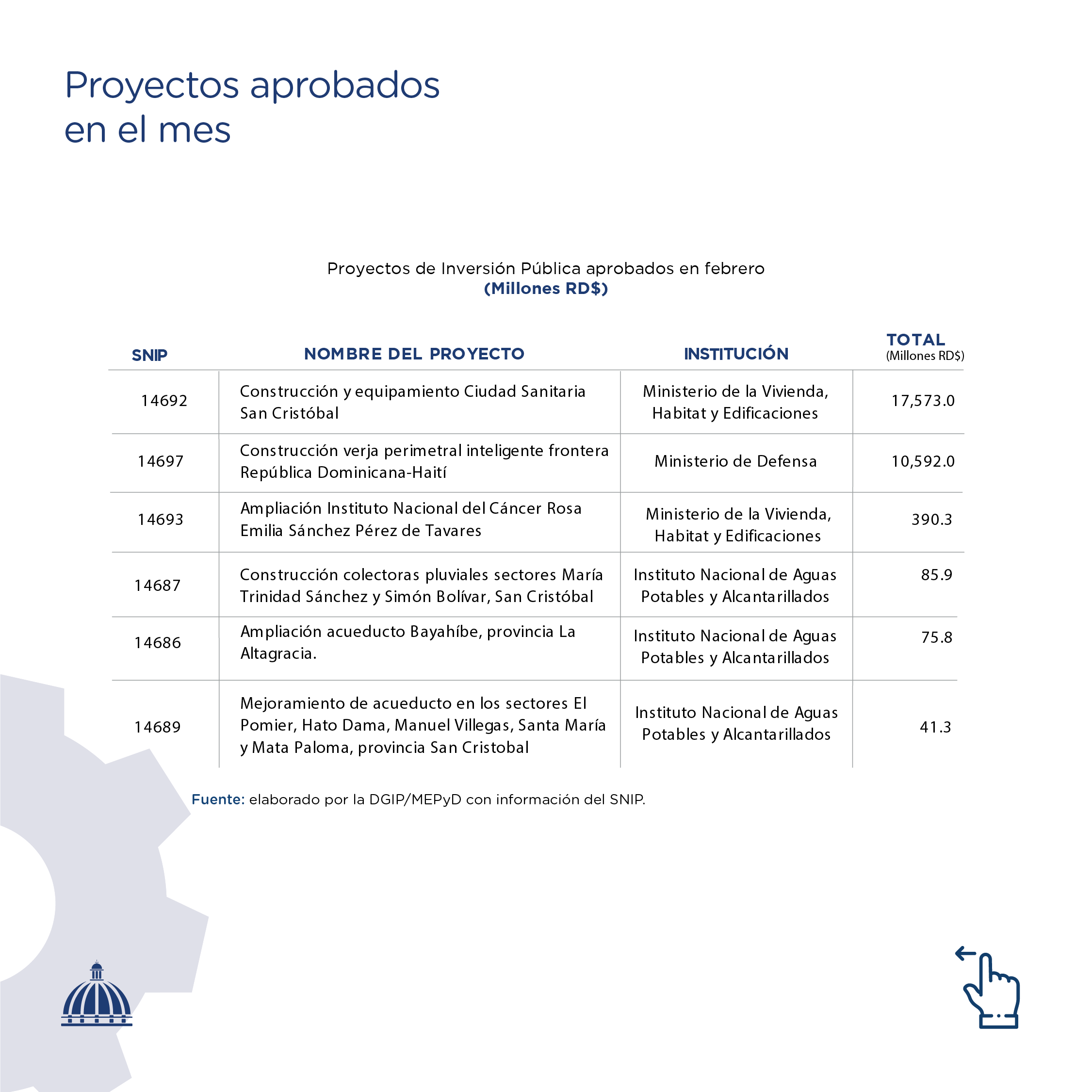 Entre los proyectos aprobados figuran la construcción de la verja perimetral inteligente frontera República Dominicana-Haití, la construcción y equipamiento Ciudad Sanitaria San Cristóbal, ampliación del Instituto Nacional del Cáncer Rosa Emilia Sánchez Pérez de Tavares, construcción colectoras pluviales sectores María Trinidad Sánchez y Simón Bolívar, San Cristóbal, y la ampliación acueducto Bayahíbe, provincia La Altagracia.