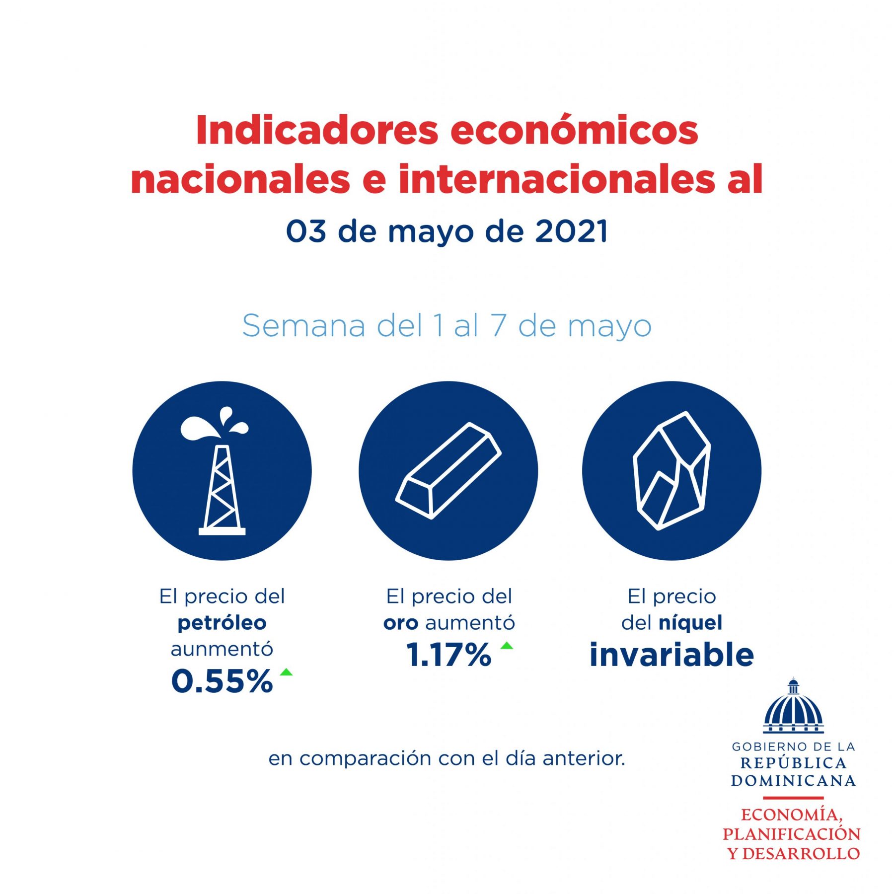 Agrega que al 3 de mayo, los precios del petróleo, el oro, el café, y el cacao aumentaron 0.55%, 1.17%, 0.96% y 1.92% respectivamente, en comparación con el día anterior. El precio del níquel se mantuvo invariable.