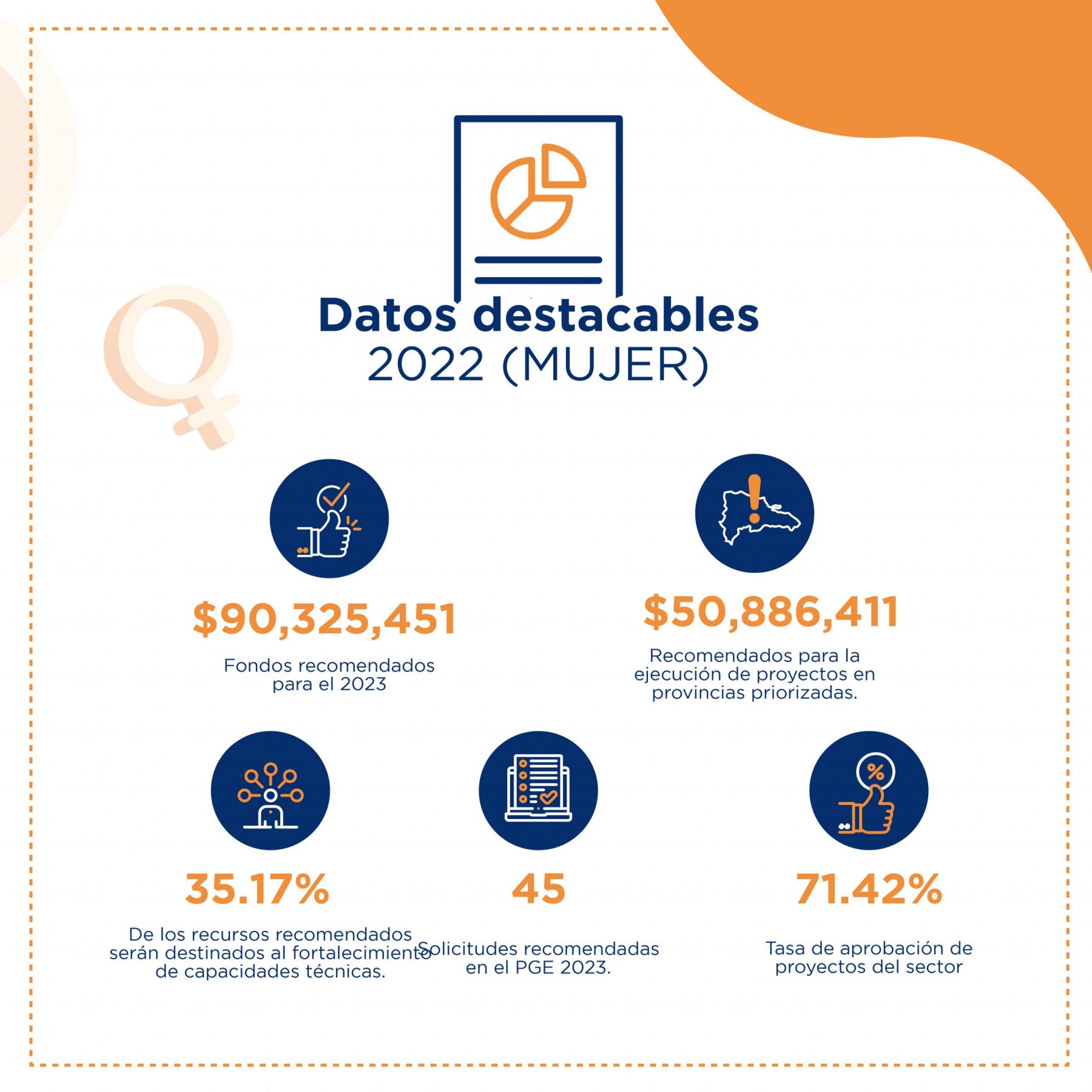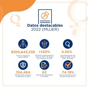 El informe explica que el 4.55% del presupuesto asignado en 2022 será dedicado a organizaciones de mujeres, de los cuales más de 100 mil personas serán beneficiarios directos e indirectos, con un 74.19% de proyectos aprobados para el sector.