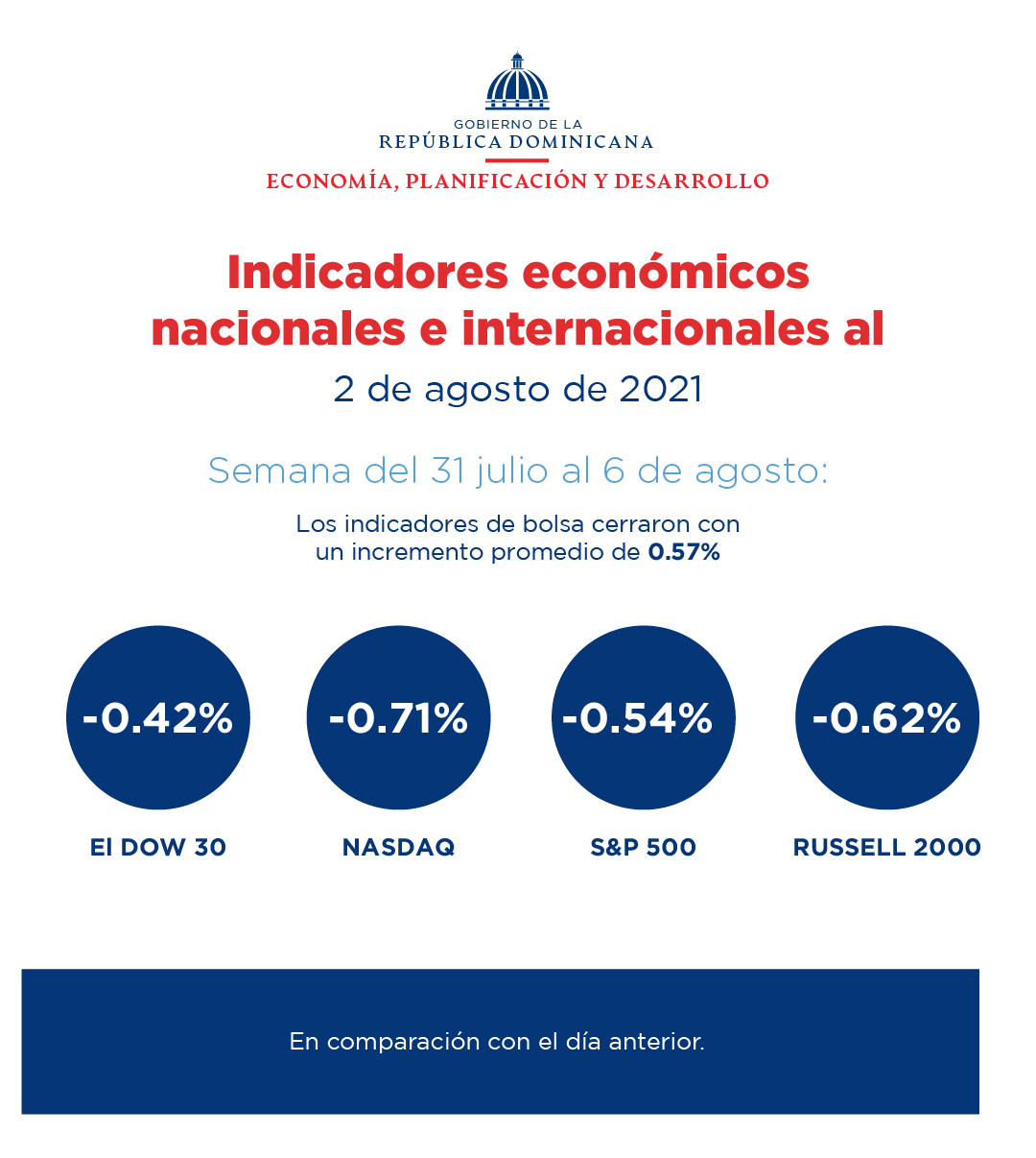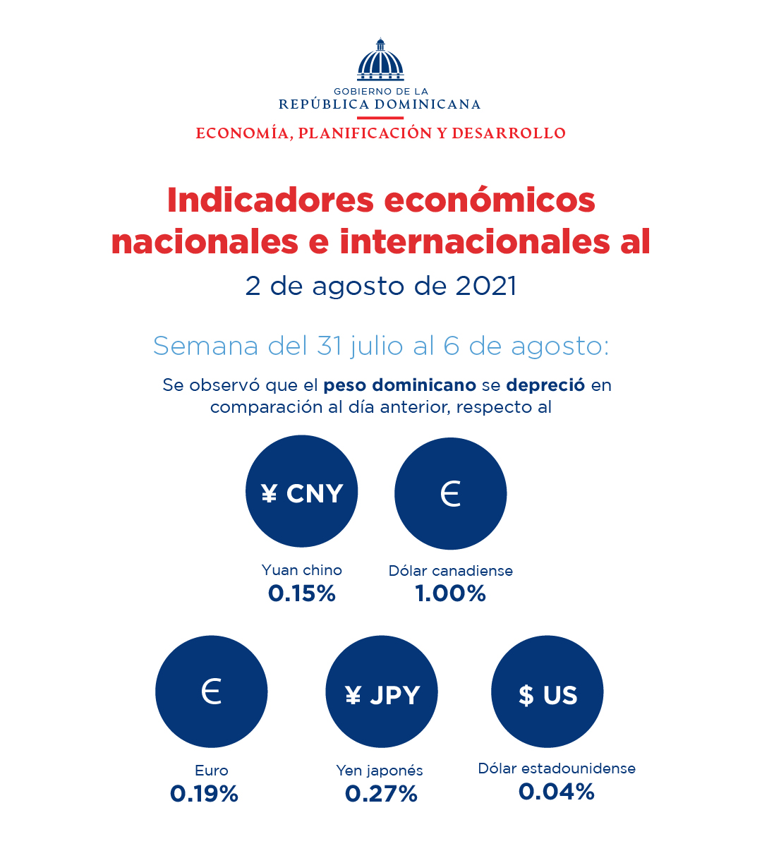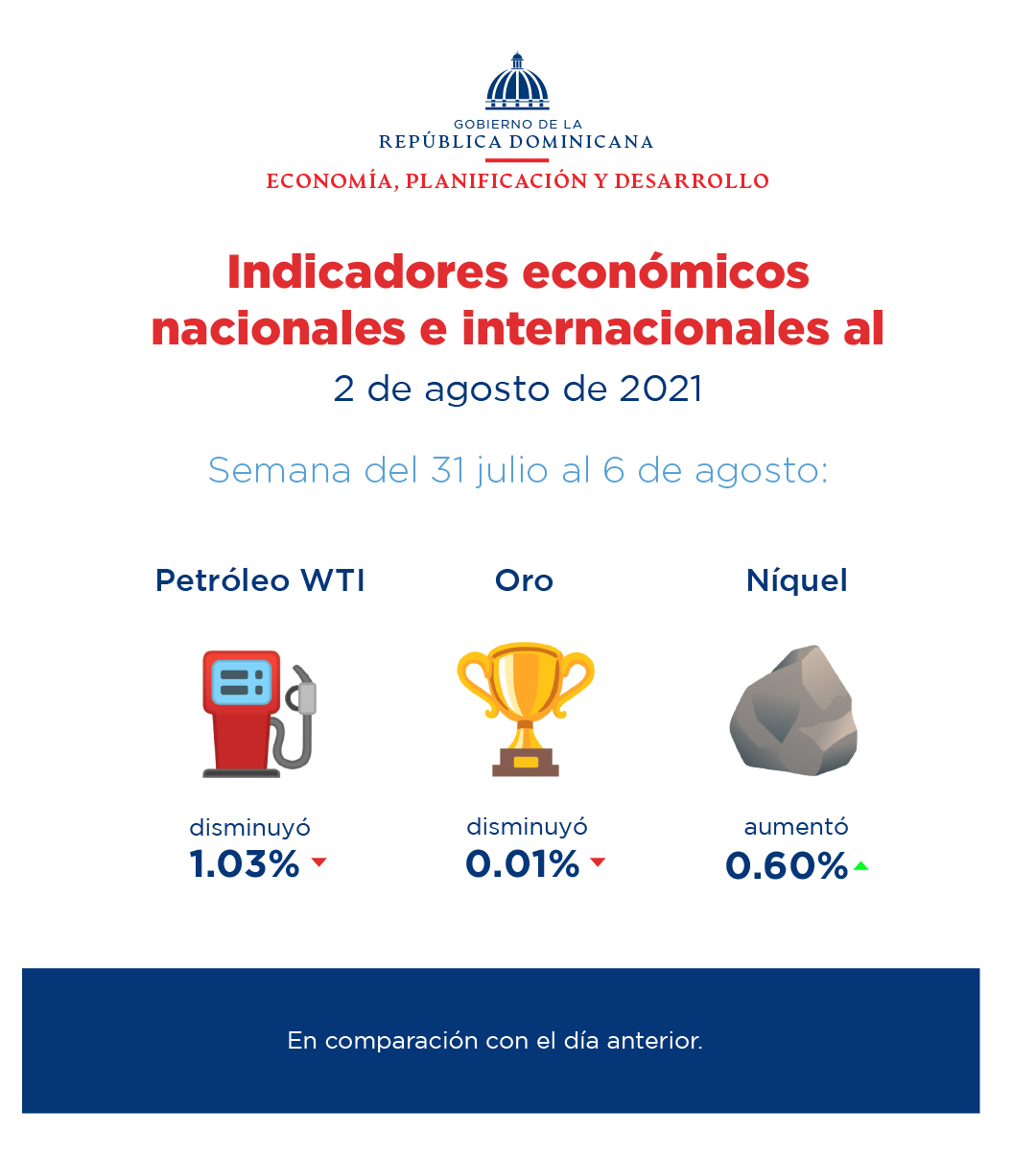 Santo Domingo. República Dominicana (Julio 2021). El Ministerio de Economía, Planificación y Desarrollo, a través de la dirección de Análisis Macroeconómico, del viceministerio de Análisis Económico y Social, ofreció un resumen de las informaciones más relevantes referentes a los principales indicadores económicos nacionales e internacionales de interés para la República Dominicana, al día 2 de agosto del año 2021.