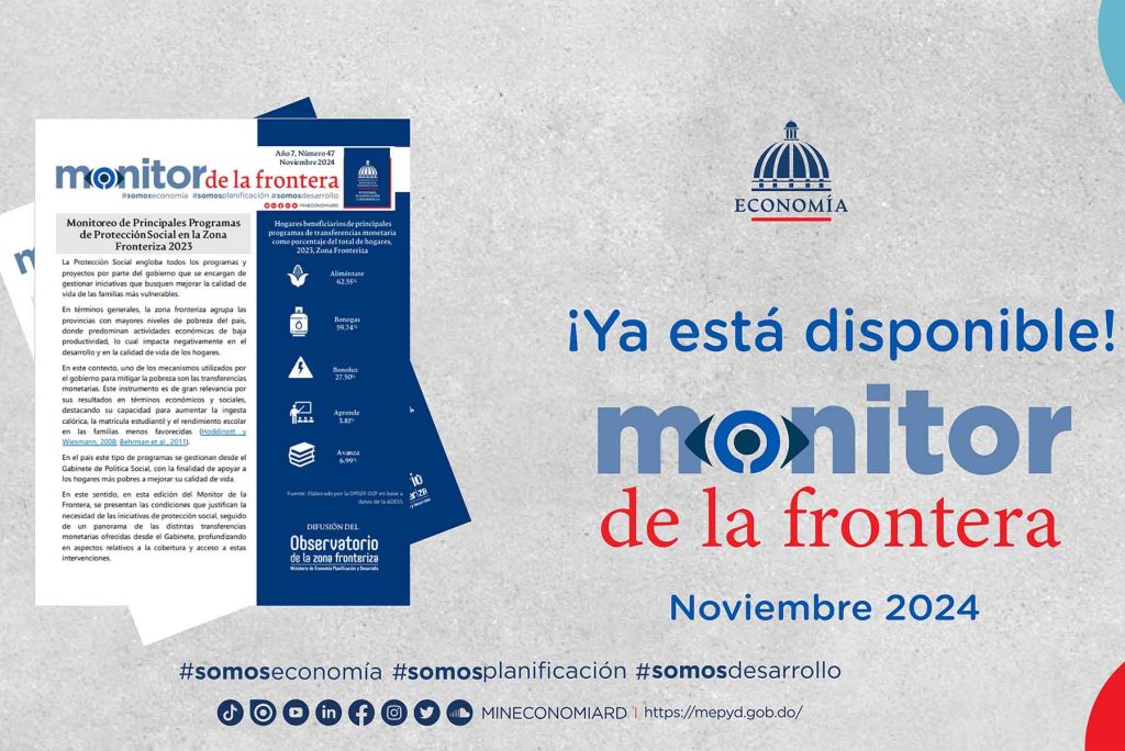 Santo Domingo, República Dominicana (Enero de 2025).- El Ministerio de Economía, Planificación y Desarrollo publica el informe “Monitor de la frontera” correspondiente a noviembre de 2024, en el cual se aborda el estado de los principales programas de protección social implementados en la zona fronteriza para mejorar la calidad de vida de las familias más vulnerables, a partir de datos actualizados hasta el año 2023.