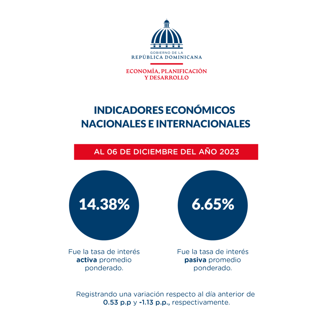 Al 6 de diciembre, continúa la publicación, la tasa de interés activa promedio ponderado fue de 14.38 %, mientras que la tasa de interés pasiva promedio ponderado fue de 6.65 %, registrando una variación respecto al día anterior de 0.53 p.p. y -1.13 p.p., respectivamente.