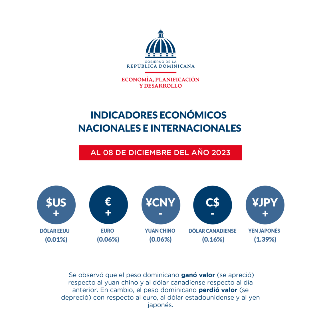 Añade que, al 8 de diciembre, se observó que el peso dominicano ganó valor (se apreció) respecto al yuan chino (-0.06 %) y al dólar canadiense (-0.16 %), respecto al día anterior. En cambio, la moneda nacional perdió valor (se depreció) con respecto al euro (0.06 %), al dólar estadounidense (0.01 %) y al yen japonés (1.39 %).