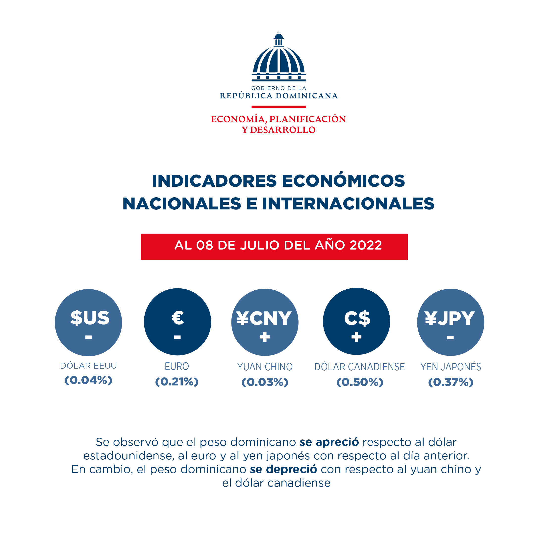 Al 8 de julio, resalta el resumen, se observó que el peso dominicano se apreció respecto al dólar estadounidense (-0.04 %), al euro (-0.21 %) y al yen japonés (-0.37 %), en comparación con el día anterior. En cambio, el peso se depreció con respecto al yuan chino (0.03 %) y el dólar canadiense (0.50 %).