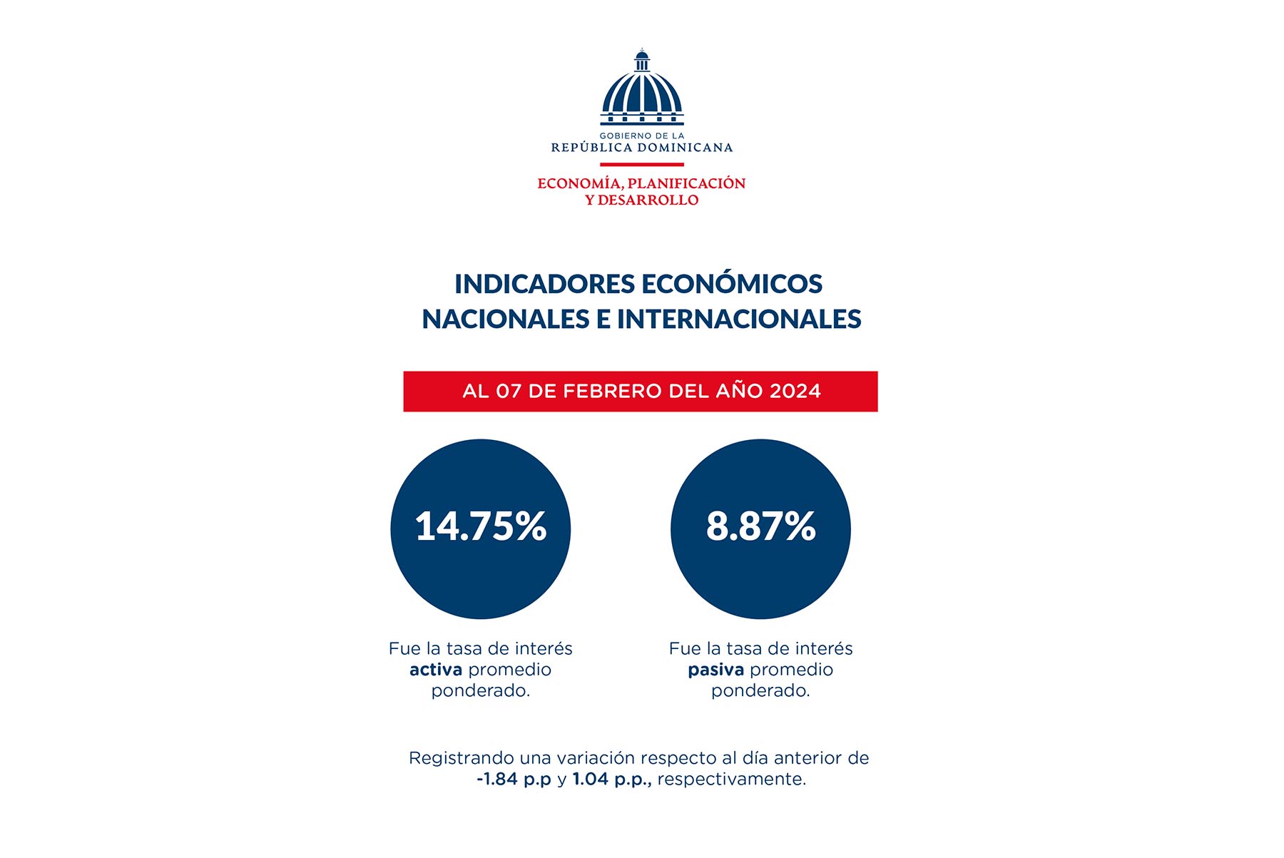 El documento puntualiza que 7 de febrero, la tasa de interés activa promedio ponderado fue de 14.75 %, mientras que la tasa de interés pasiva promedio ponderado fue de 8.87 %, registrando una variación respecto al día anterior de -1.84 p.p. y 1.04 p.p., respectivamente.