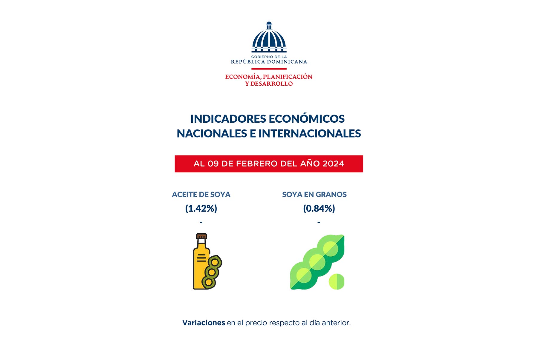 14 febrero, 2024La publicación semanal, realizada por la Dirección de Análisis Macroeconómico del Viceministerio de Análisis Económico y Social indica que el precio del aceite de soya disminuyó en 1.42 %, la soya en granos en 0.84 % y el maíz en 0.98 %, respecto al día anterior.