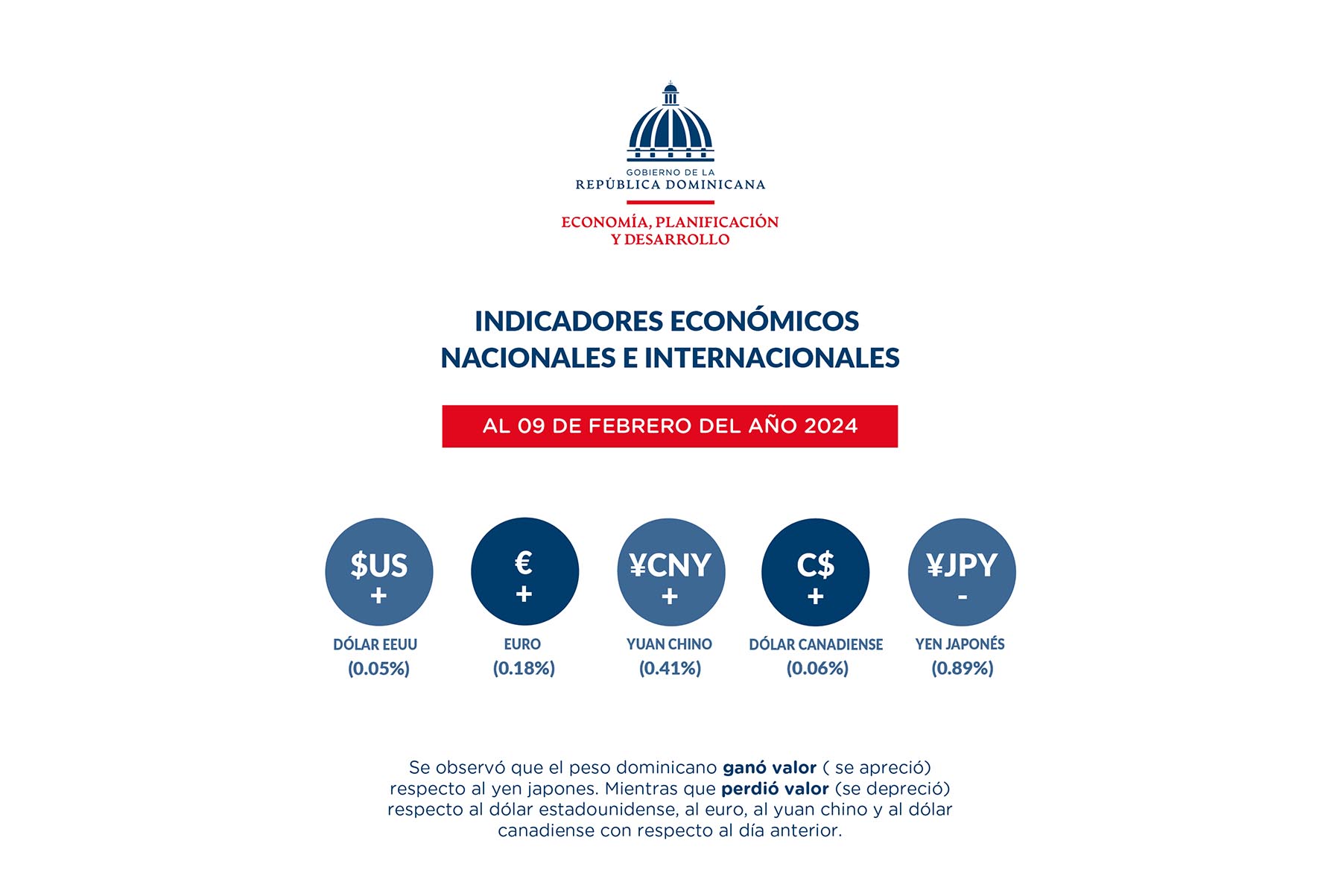 Sostiene que, al nueve de febrero, se observó que el peso dominicano perdió valor (se depreció) respecto al dólar estadounidense (0.05 %), al euro (0.18 %), al yuan chino (0.41 %) y al dólar canadiense (0.06 %) en comparación con la tasa del día anterior. En cambio, el peso dominicano ganó valor (se apreció) respecto al yen japones (-0.89 %).