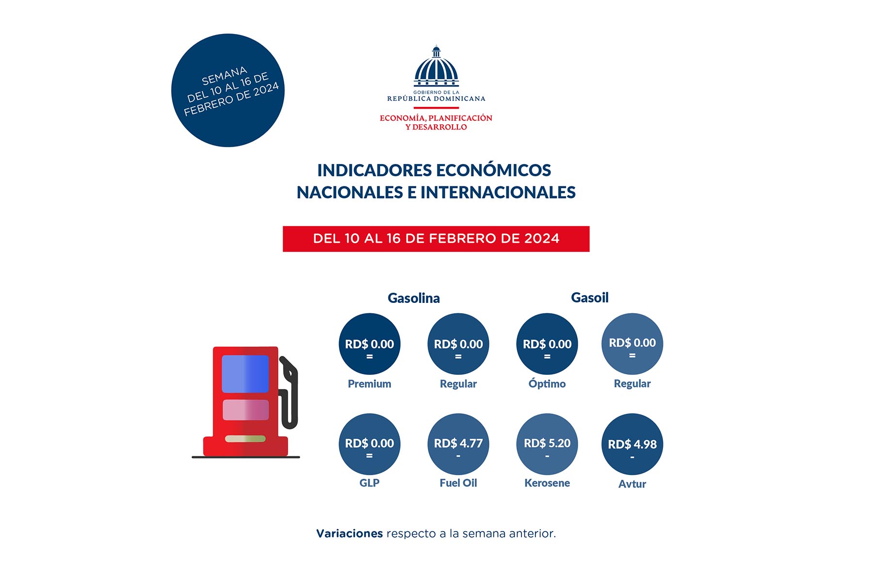 Señala que, en la semana del 10 al 16 de febrero de 2024, los precios de los combustibles en el mercado nacional se mantuvieron invariables, con la excepción del fuel oil, el avtur y el kerosene, que registraron disminuciones de RD$ 4.77, RD$ 4.98 y RD$ 5.20 respectivamente, en comparación con la semana anterior.