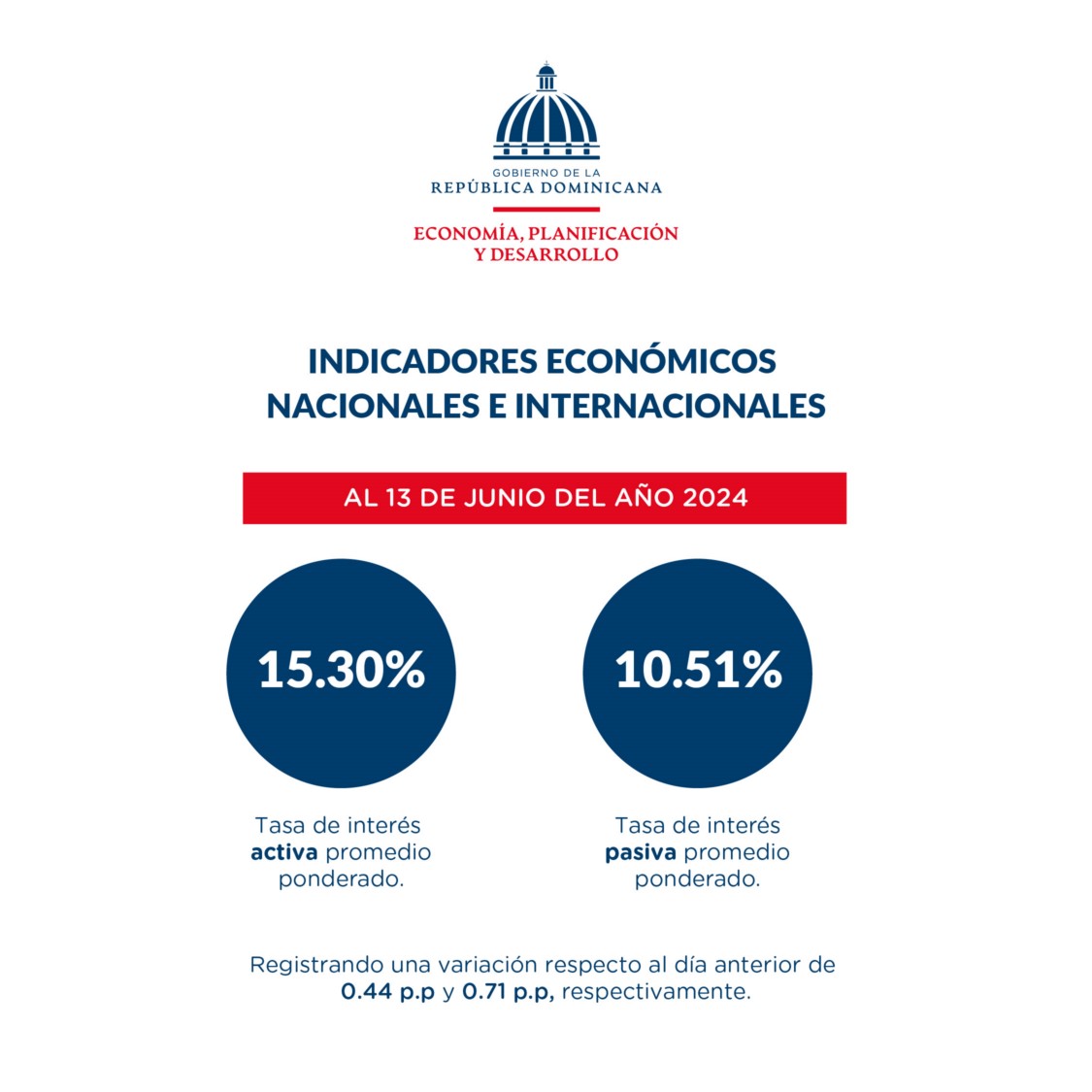 Según la publicación, al 13 de junio, la tasa de interés activa promedio ponderado fue de 15.30 %, con una variación negativa respecto al día anterior de 0.44 p.p., y la tasa de interés pasiva promedio ponderado fue de 10.51 %, con una variación de positiva, respecto al día anterior de 0.71 p.p.