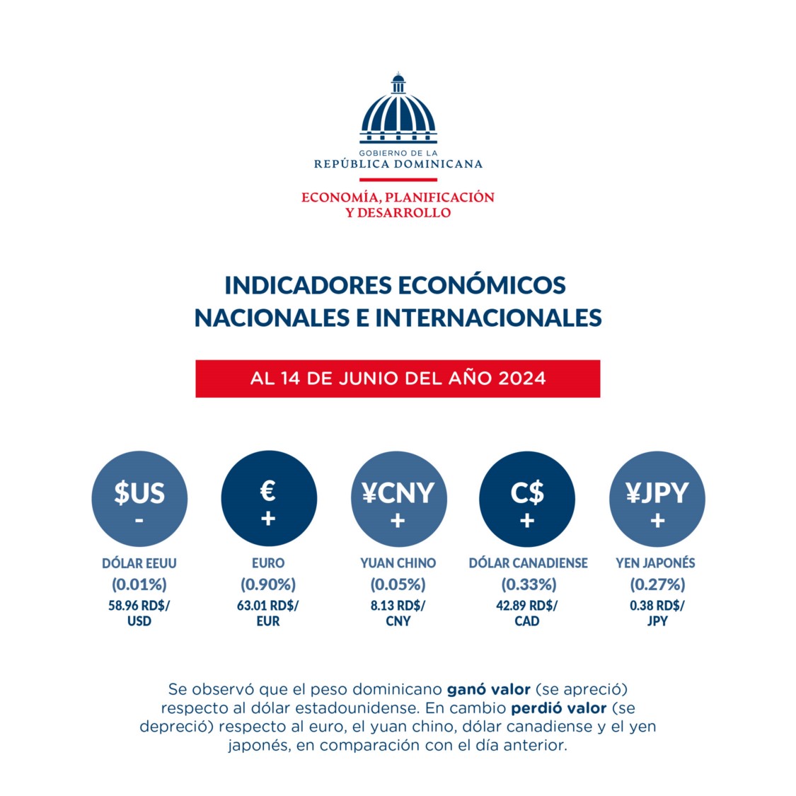 El resumen agrega que, al 14 de junio, se observó que la mayoría de divisas de referencia ganaron valor con relación al peso dominicano, en comparación con el día anterior. El euro aumentó en 0.90 %, para cotizar a 63.01 RD$ por EUR; el yen japonés en 0.27 %, con una cotización de 0.38 RD$ por JPY; el dólar canadiense en 0.33 %, para cotizar a 42.89 RD$ por CAD; el yuan chino en 0.05 %, con una cotización de 8.13 RD$ por CNY; mientras que el dólar estadounidense perdió valor frente al peso dominicano en 0.01 %, para cotizar a 58.96 RD$ por USD.