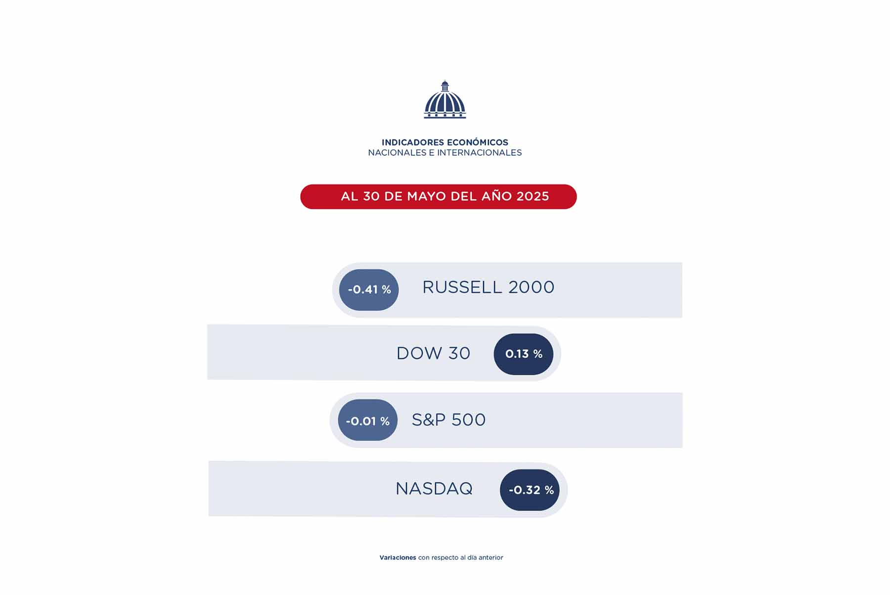 Subraya que, al 30 de mayo, los indicadores de bolsa cerraron con variaciones heterogéneas en sus cotizaciones, con respecto al día anterior. En ese orden, el NASDAQ registró una variación de -0.32 %, el DOW 30 de 0.13 %, el S&P 500 de -0.01 % y el RUSSELL 2000 de -0.41 %.