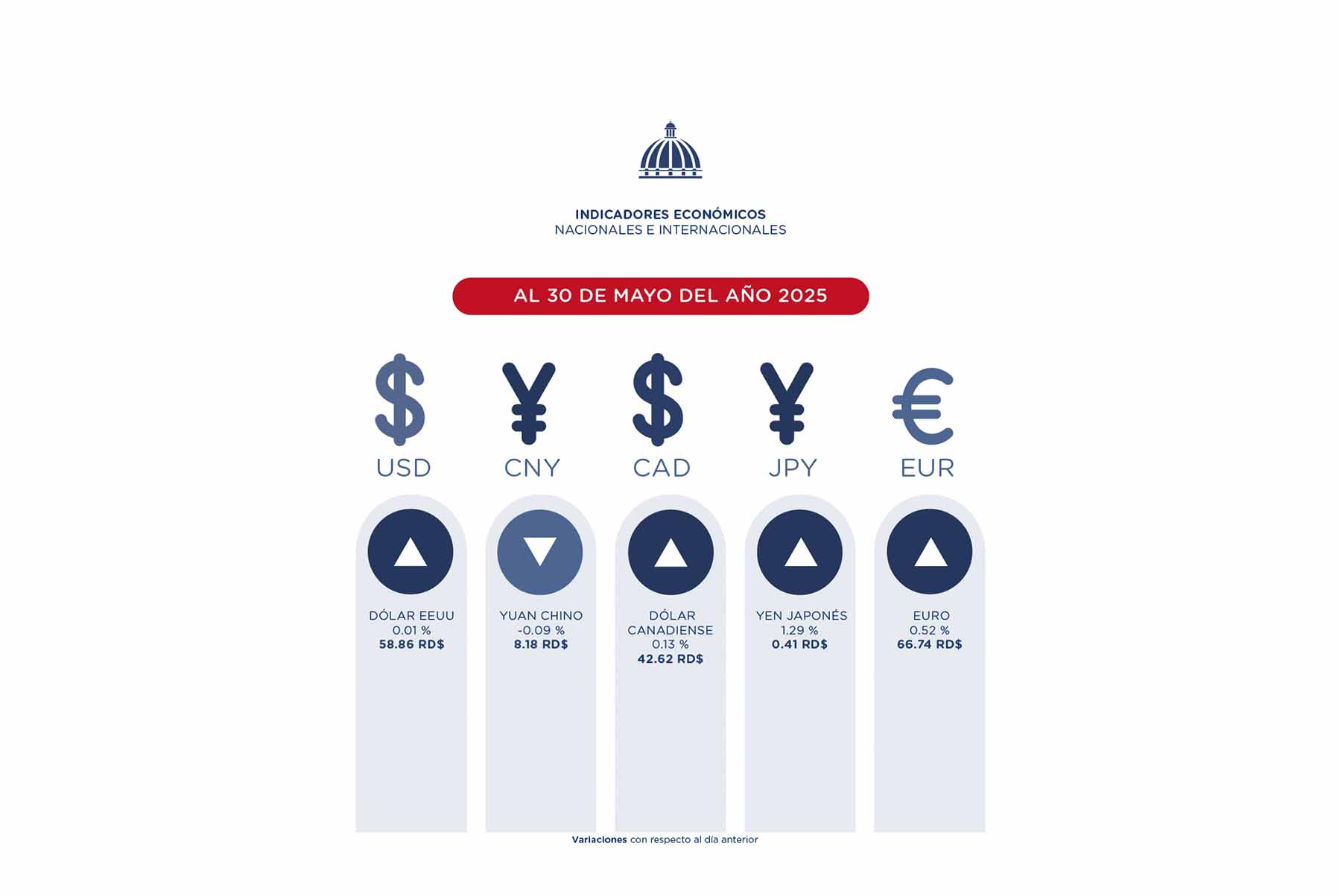Según el resumen, al 30 de mayo, se observa que el peso dominicano perdió valor con respecto a la mayoría de las principales divisas de referencia en el mercado internacional. En ese aspecto, el peso dominicano perdió valor con respecto al euro en 0.52 % (66.74 RD$ / EUR), el yen japonés en 1.29 % (0.41 RD$ / JPY), el dólar canadiense en 0.13 % (42.62 RD$ / CAD) y el dólar estadounidense 0.01 % (58.86 RD$ / USD). Por otra parte, el peso ganó valor con respecto al yuan chino en -0.09 % (8.18 RD$ / CNY).