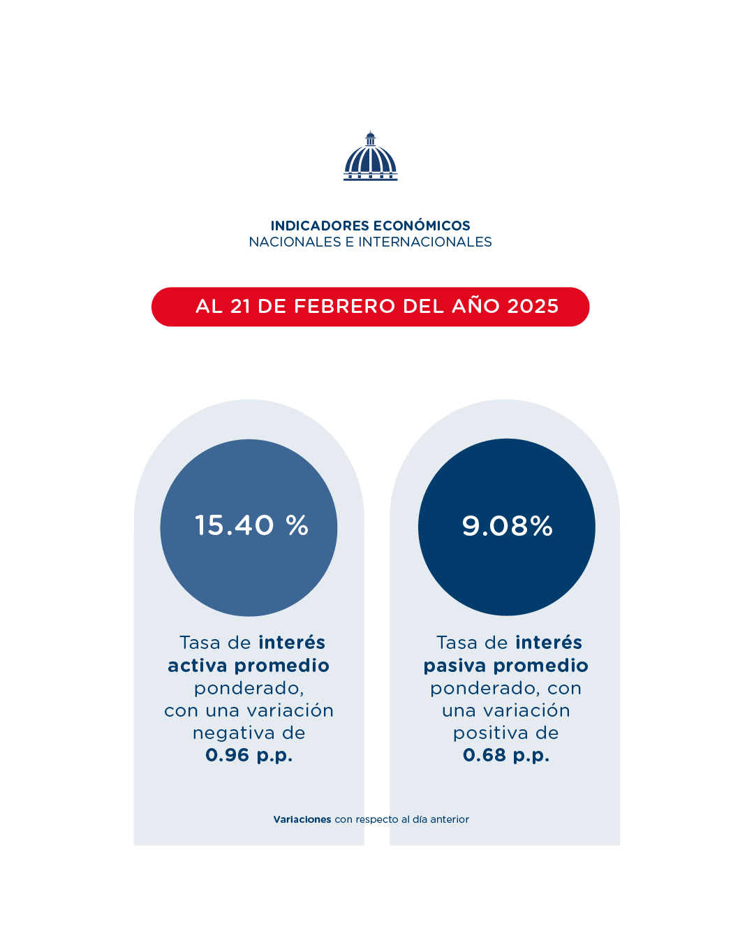 Según el documento, al 21 de febrero, en el sector financiero, la tasa de interés activa promedio ponderado fue de 15.40 %, con una variación negativa respecto al día anterior de 0.96 p.p., y la tasa de interés pasiva promedio ponderado fue 9.08 %, con una variación positiva 0.68 p.p. respecto al día anterior.