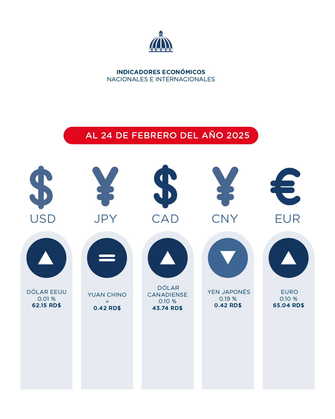 Apunta que, al 24 de febrero, se observa que las divisas de referencia en el mercado internacional presentaron valores heterogéneos. El peso dominicano ganó valor con respecto al dólar canadiense en un 0.10 % (RD$ 43.74 RD$ / USD), al euro en un 0.10 % (65.04 RD$ / EUR), al dólar estadounidense en 0.01 % (62.15 RD$ / CAD). Perdió valor con respecto al yen japonés en 0.19 % (0.42 RD$ / JPY). La tasa de cambio con respecto al yuan chino se mantuvo invariable con respecto al día anterior (RD$ 0.42 / CNY).