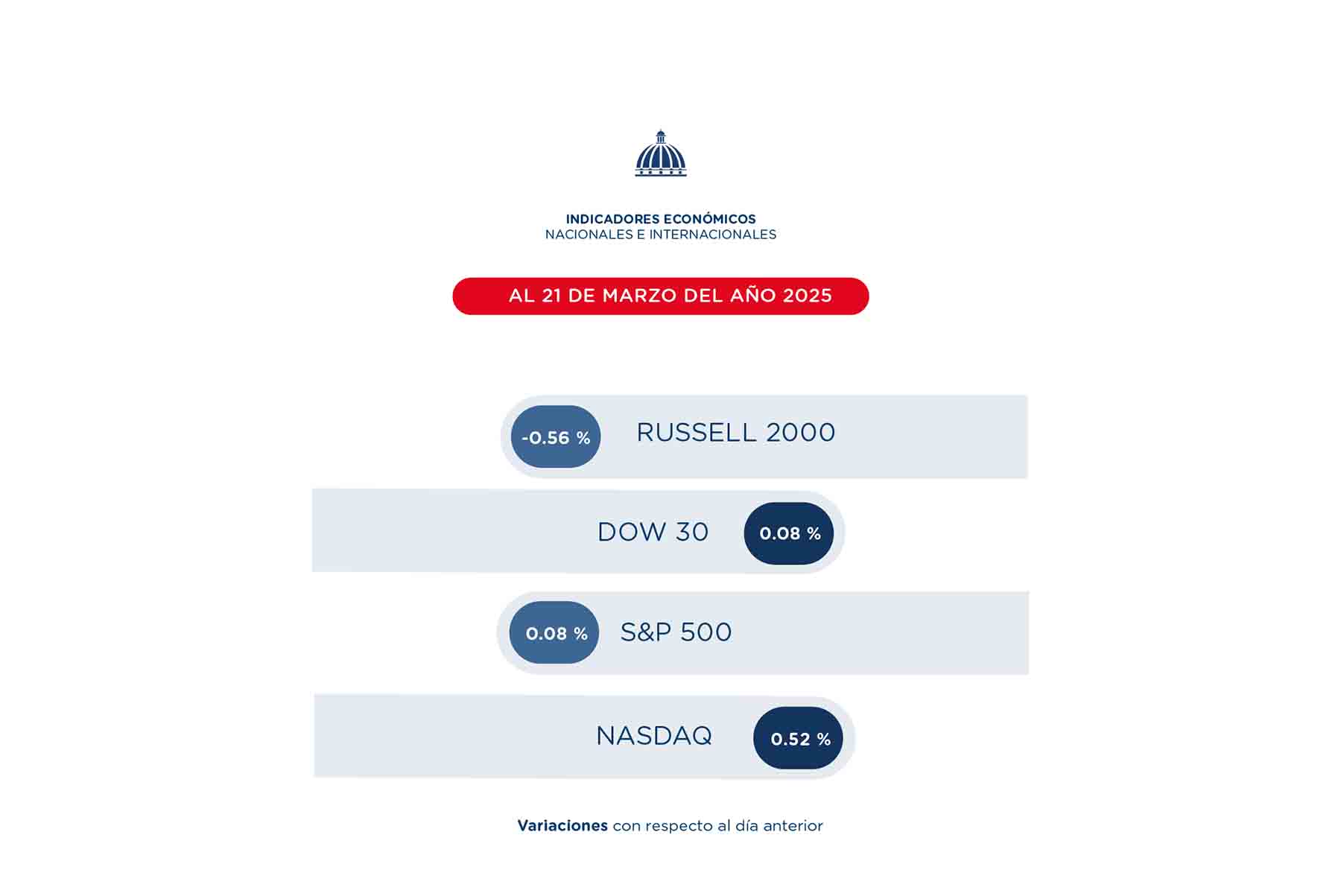 En ese aspecto, desglosa que el índice NASDAQ registró una variación de 0.52 %, el DOW 30 de 0.08 %, el S&P 500 de 0.08 %, mientras que el índice RUSSELL 2000 registró una caída de -0.56 %.
