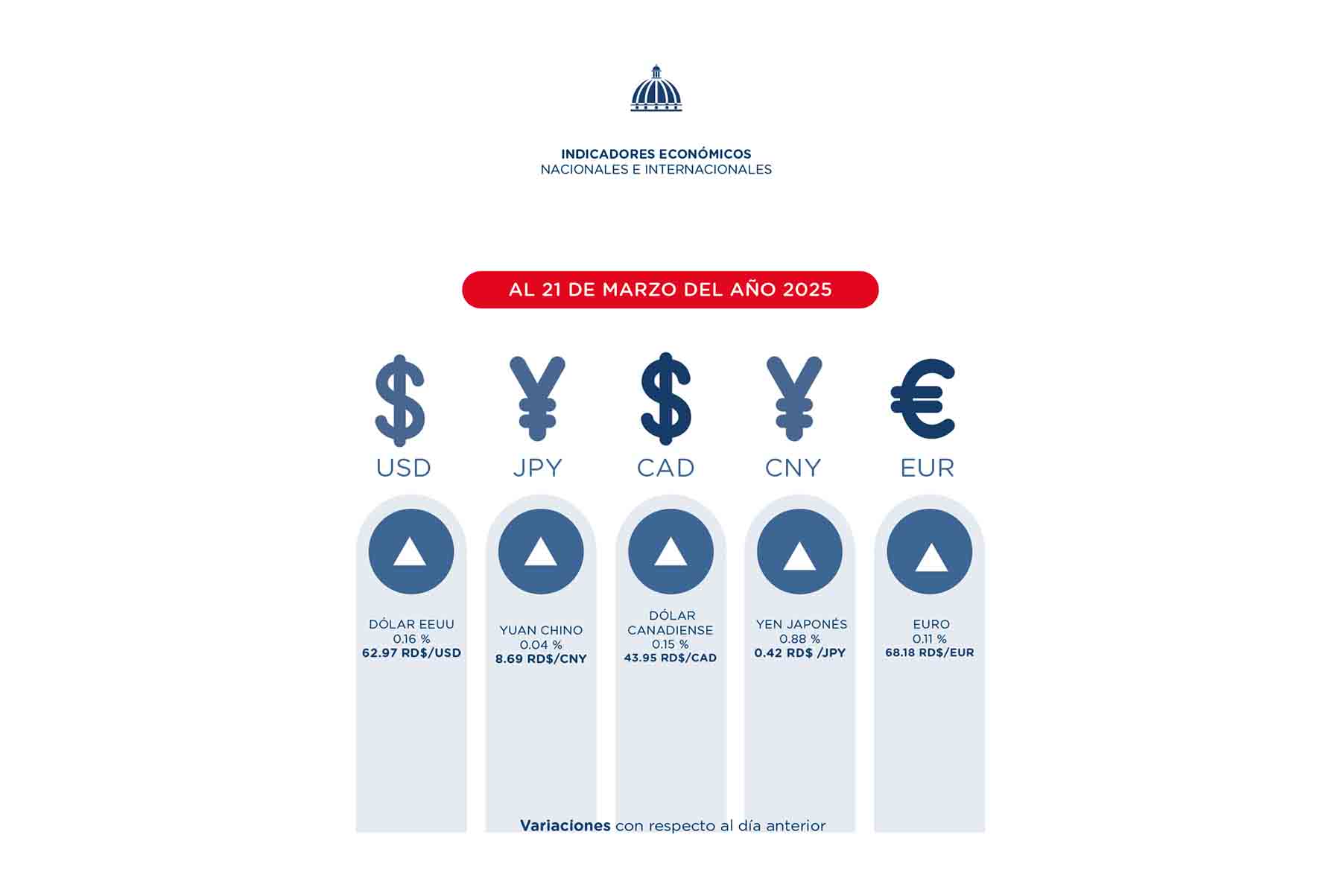 Puntualiza que al 21 de marzo, se observa que el peso dominicano presentó variaciones homogéneas con pérdida de valor frente a las divisas de referencia. En ese sentido, señala que el peso dominicano perdió valor con respecto al yen japonés en 0.88 % (0.42 RD$ / JPY), el dólar estadounidense en 0.16 % (62.97 RD$ / USD), el euro en 0.11 % (68.18 RD$ / EUR), el yuan chino en 0.04 % (RD$ 8.69 / CNY) y dólar canadiense en un 0.15 % (RD$ 43.95 RD$ / CAD).