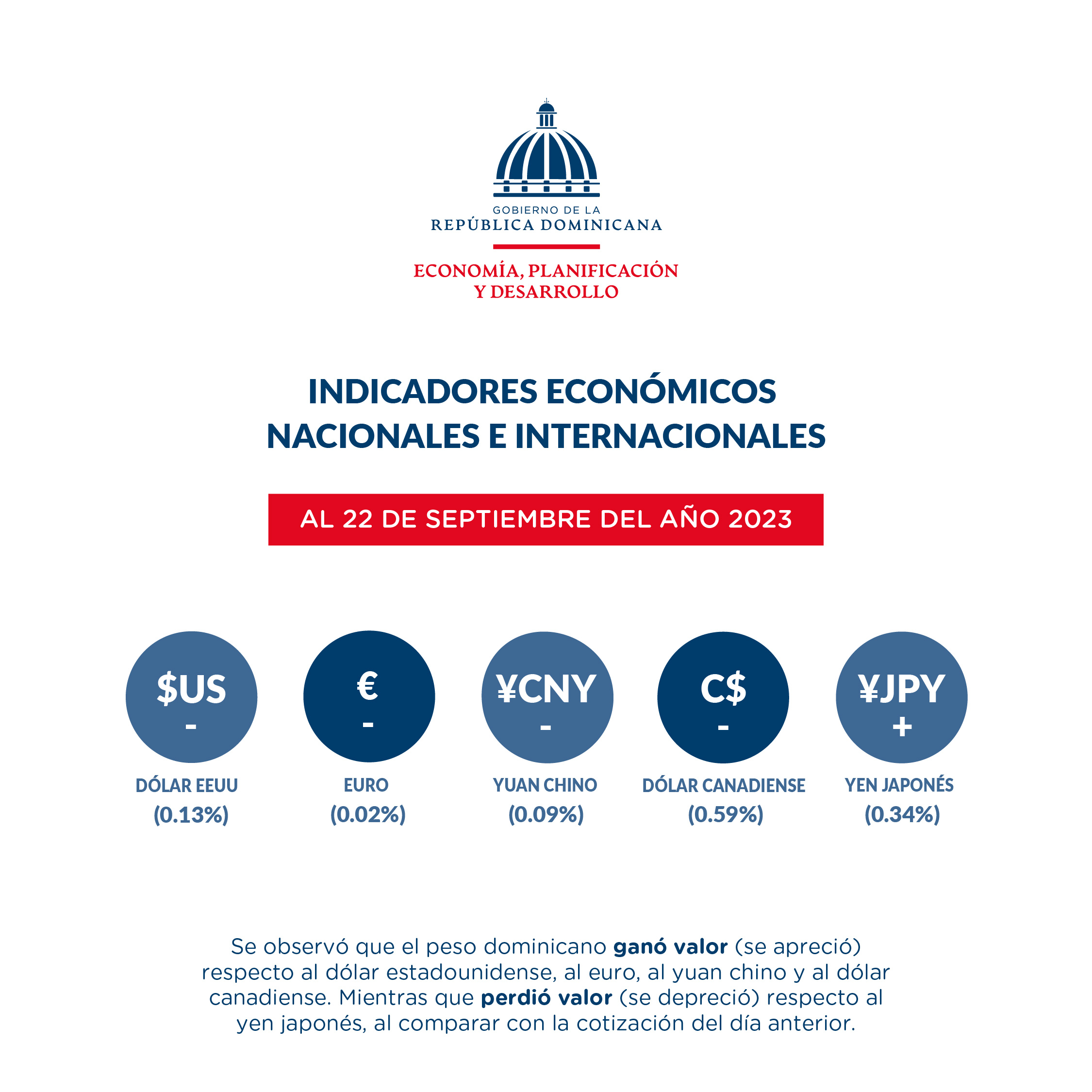 Al 22 de septiembre, afirma la publicación, se observó que el peso dominicano ganó valor (se apreció) respecto al dólar estadounidense (-0.13 %), al euro (-0.02 %), al yuan chino (-0.09 %) y al dólar canadiense (-0.59 %), en comparación con el día anterior. Mientras que perdió valor (se depreció) respecto al yen japonés (0.34 %).