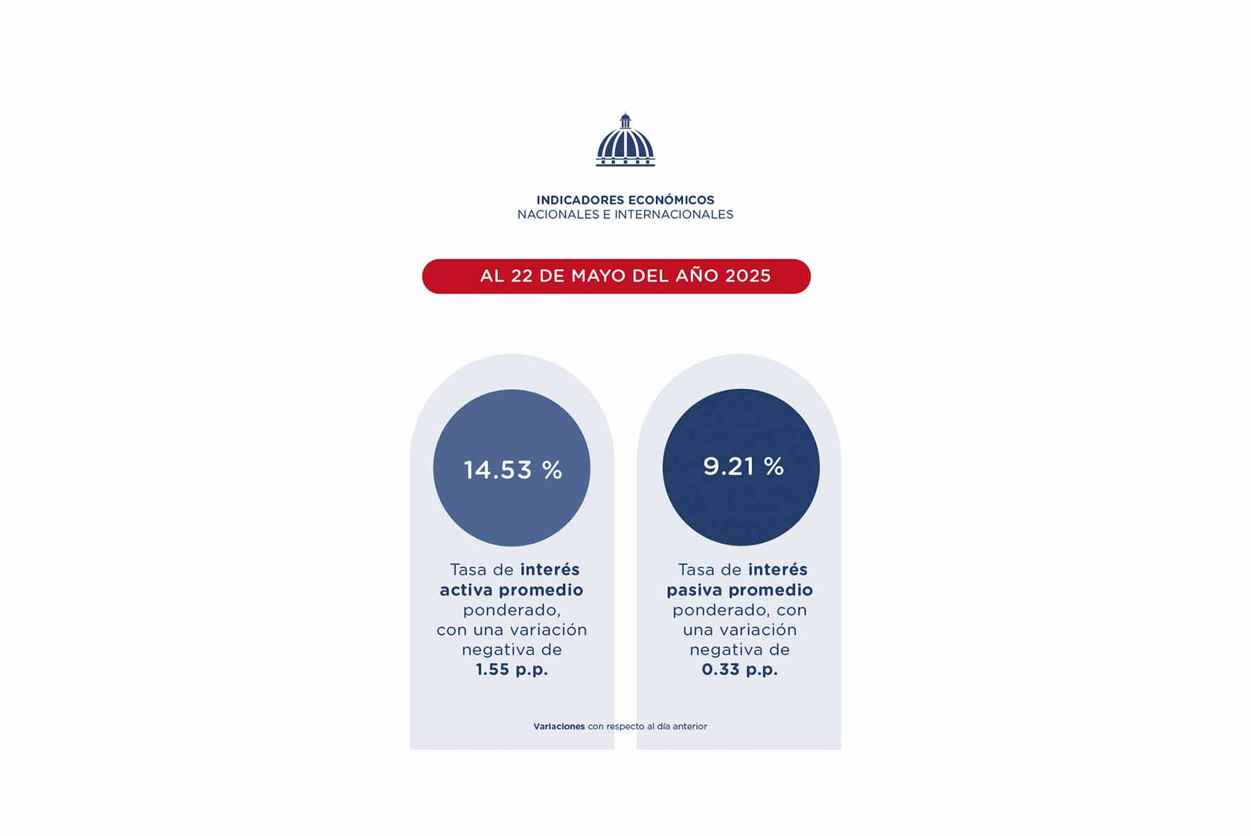 Según el resumen, al 22 de mayo, en el sector financiero, la tasa de interés activa promedio ponderado fue de 14.53 %, con una variación negativa respecto al día anterior de 1.55 p.p., y la tasa de interés pasiva promedio ponderado fue de 9.21 %, con una variación negativa de 0.33 p.p. respecto al día anterior.