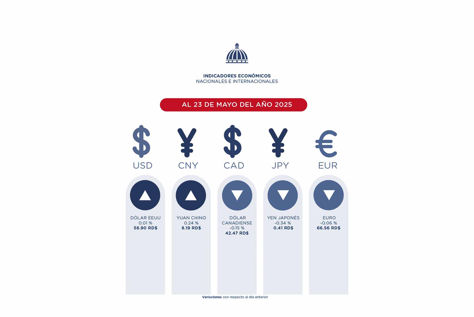 De acuerdo con el resumen, al 23 de mayo, se observa que el peso dominicano presentó variaciones heterogéneas con respecto a las principales divisas de referencia en el mercado internacional. Indica que el peso dominicano ganó valor con respecto al euro en -0.06 % (66.56 RD$ / EUR), el yen japonés en -0.34 % (0.41 RD$ / JPY) y el dólar canadiense en -0.15 % (42.47 RD$ / CAD). Por otra parte, el peso perdió valor con respecto al yuan chino en 0.24 % (8.19 RD$ / CNY) y el dólar estadounidense 0.01 % (58.90 RD$ / USD).