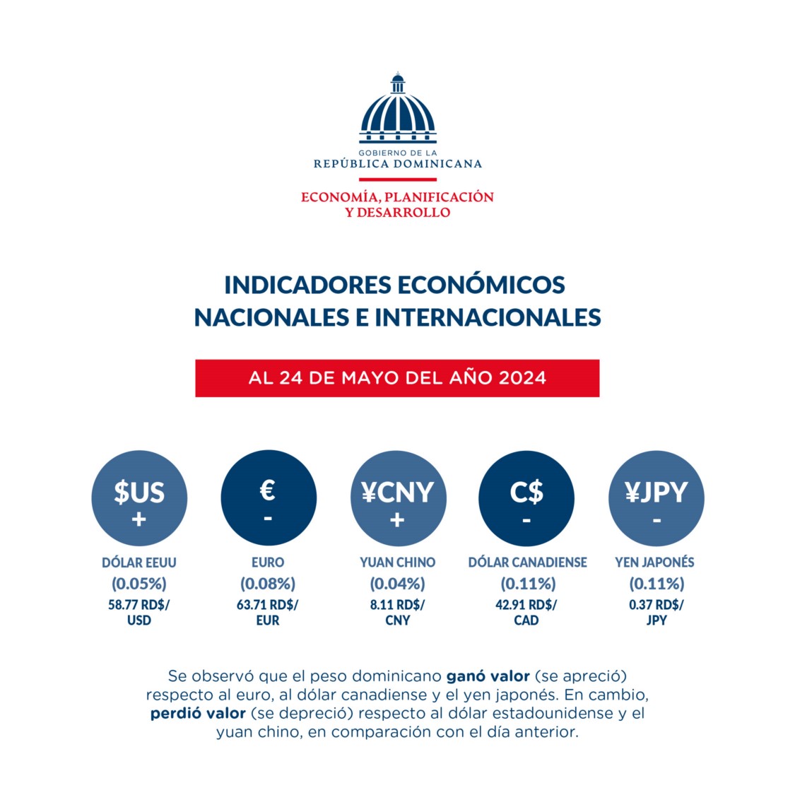 Sostiene que, al 24 de mayo, se observó que el peso dominicano perdió valor (se depreció) respecto al dólar estadounidense en 0.05 %, para cotizar a 58.77 RD$ por USD; y al yuan chino en 0.04 %, con una cotización de 8.11 RD$ por CNY. Por el contrario, la moneda nacional se apreció (ganó valor) respecto al yen japonés en 0.11 %, para cotizar a 0.37 RD$ por JPY; al dólar canadiense en 0.11 %, con una cotización de 42.91 RD$ por CAD; y al euro en 0.08 %, para cotizar a 63.71 RD$ por EUR, en comparación con el día anterior.