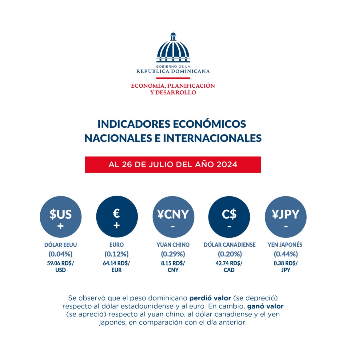 Al 26 de julio, se observa que el peso dominicano ganó valor con respecto a la mayoría de las divisas de referencia, es decir, con respecto al yen japonés en un 0.44 % (0.38 RD$ / JPY), al yuan chino en 0.29 % (8.15 RD$ / CNY) y el dólar canadiense en un 0.20 % (42.74 RD$ / CAD). Por otro lado, la moneda nacional perdió valor con respecto al euro en 0.12 % (64.14 RD$ / EUR) y el dólar estadounidense 0.04 % (59.06 RD$ / USD).