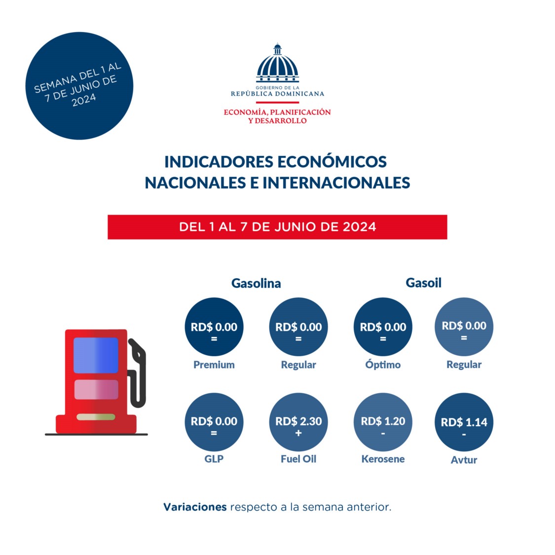 Detalla que, en la semana del primero al 7 de junio de 2024, los precios de los principales combustibles a nivel nacional permanecieron invariables frente a la semana anterior, a excepción del kerosene y el avtur, que disminuyeron en RD$ 1.20 y RD$ 1.14, respectivamente, mientras que el fuel oil aumentó en RD$ 2.30.