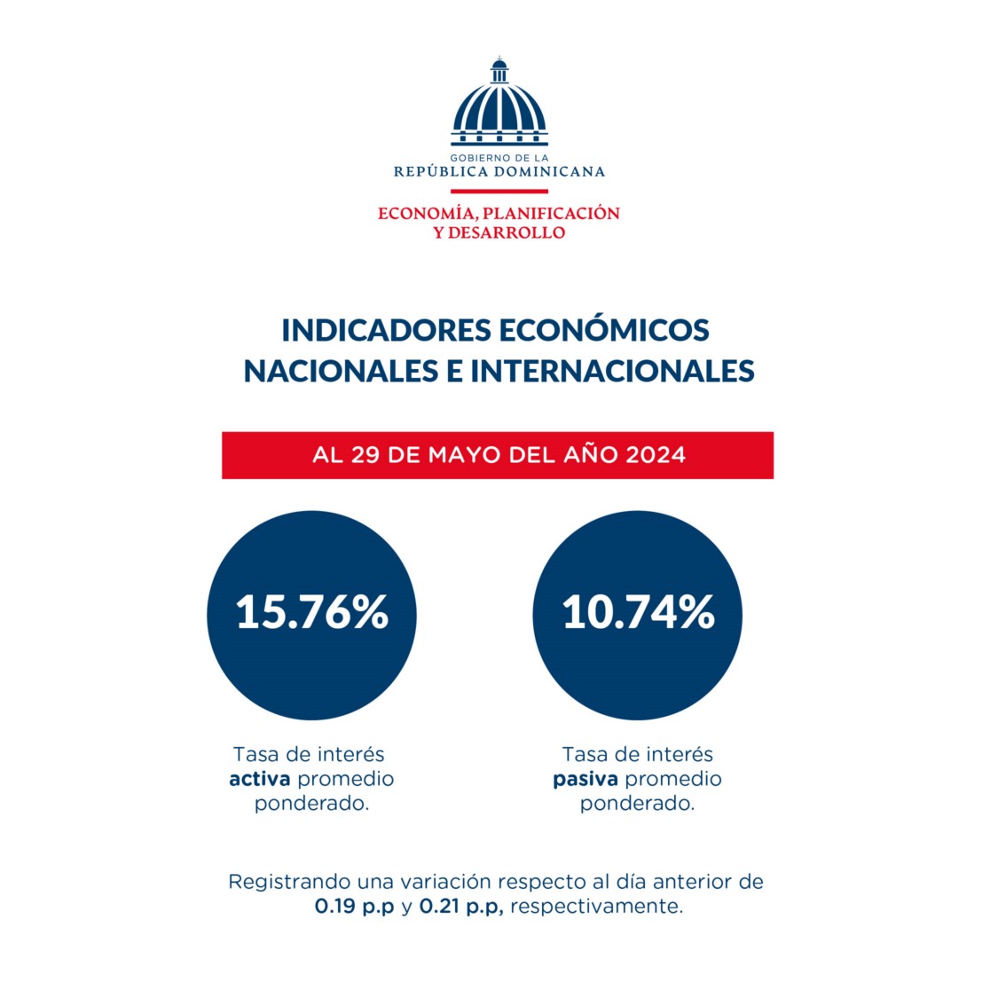 Al 29 de mayo, apunta la publicación, la tasa de interés activa promedio ponderado fue de 15.76 %, con una variación negativa respecto al día anterior de 0.19 p.p., y la tasa de interés pasiva promedio ponderado fue de 10.74 %, con una variación positiva respecto al día anterior de 0.21 p.p.