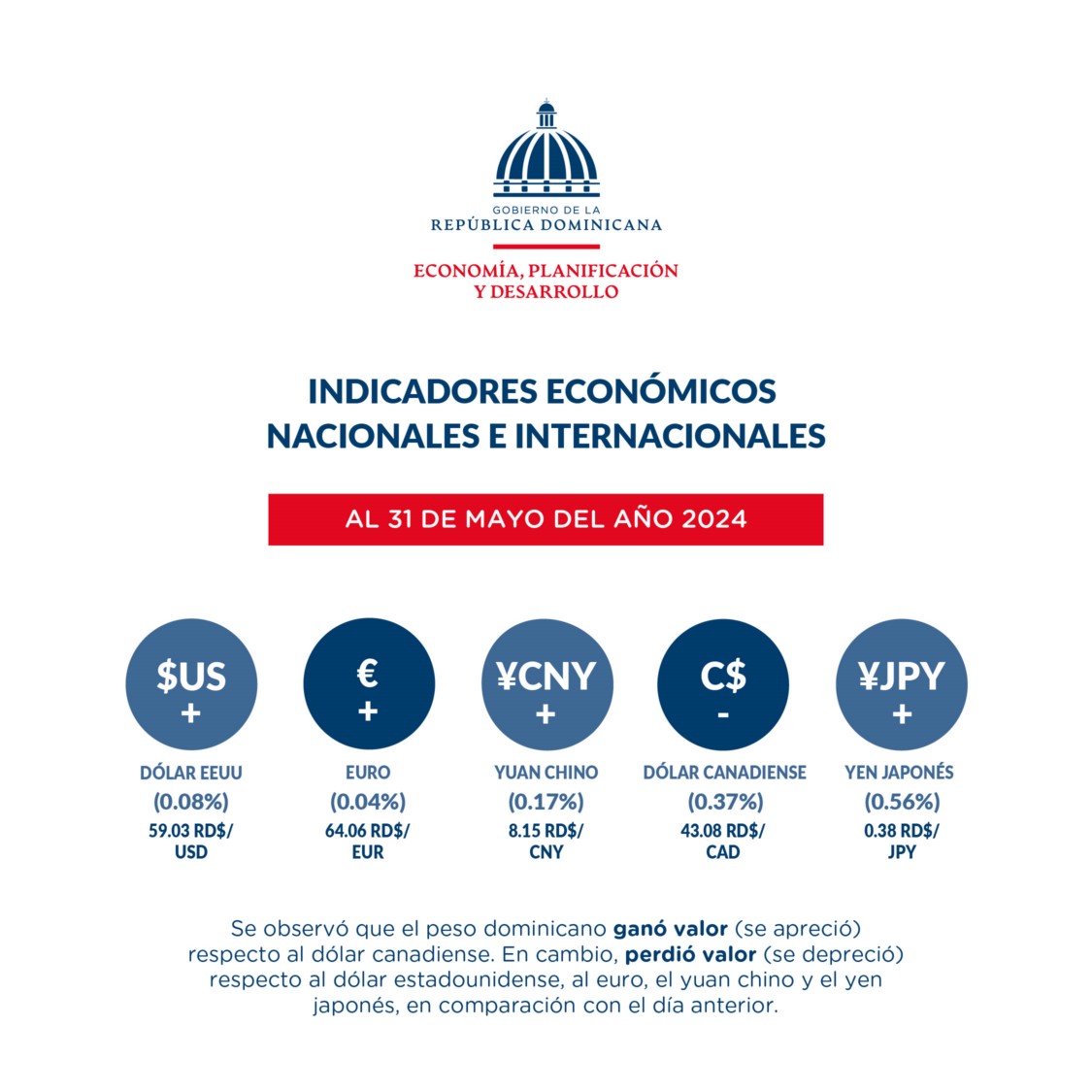 El resumen establece que, al 31 de mayo, se observó que el peso dominicano perdió valor (se depreció) respecto al yen japonés en 0.56 %, para cotizar a 0.38 RD$ por JPY; al yuan chino en 0.17 %, con una cotización de 8.15 RD$ por CNY; al dólar estadounidense en 0.08 %, para cotizar a 59.03 RD$ por USD; y al euro en 0.04 %, con una cotización de 64.06 RD$ por EUR, en comparación con el día anterior. En cambio, la moneda nacional se apreció (ganó valor) respecto al dólar canadiense en 0.37 %, para cotizar a 43.08 RD$ por CAD.