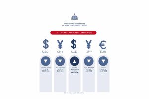 En cuanto a los tipos de cambio, al 27 de junio, se observó que el peso dominicano ganó valor con respecto a la mayoría de las principales divisas de referencia en el mercado internacional. Explica que la moneda nacional ganó valor con respecto al euro en -0.09 % (69.37 RD$ / EUR), el yuan chino en -0.19 % (8.27 RD$ / CNY), el dólar estadounidense -0.17 % (59.27 RD$ / USD) y el yen japonés en -0.05 % (0.41 RD$ / JPY). Por otra parte, el peso dominicano perdió valor con respecto al dólar canadiense en 0.54 % (43.45 RD$ / CAD).