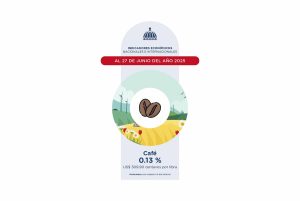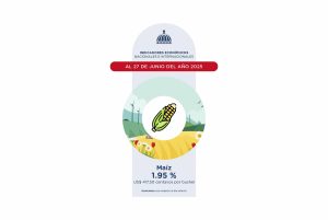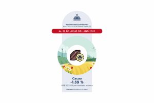 Agrega que la mayoría de los commodities alimentarios, al 27 de junio, mostraron variaciones inclinadas a lo positivo con respecto al día anterior. Precisa que aumentaron en su precio la soya en granos en 0.49 % (US$ 1,027.75 centavos por bushel), el maíz en 1.95 % (US$ 417.50 centavos por bushel), el trigo en 0.72 % (US$ 524.75 centavos por bushel) y el café en 0.13 % (US$ 309.90 centavos por libra). Por su parte, disminuyó el precio del aceite de soya en 0.13 % (US$ 52.45 centavos por libra) y el cacao en 1.39 % (US$ 9,231.00 centavos por tonelada métrica).
