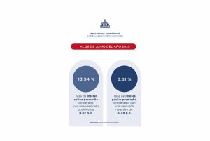 Indica que, al 26 de junio, en el sector financiero, la tasa de interés activa promedio ponderado fue de 13.94 %, con una variación positiva respecto al día anterior de 0.02 puntos porcentuales (p.p.), y la tasa de interés pasiva promedio ponderado fue de 8.81 %, con una variación negativa de -0.59 p.p. respecto al día anterior.