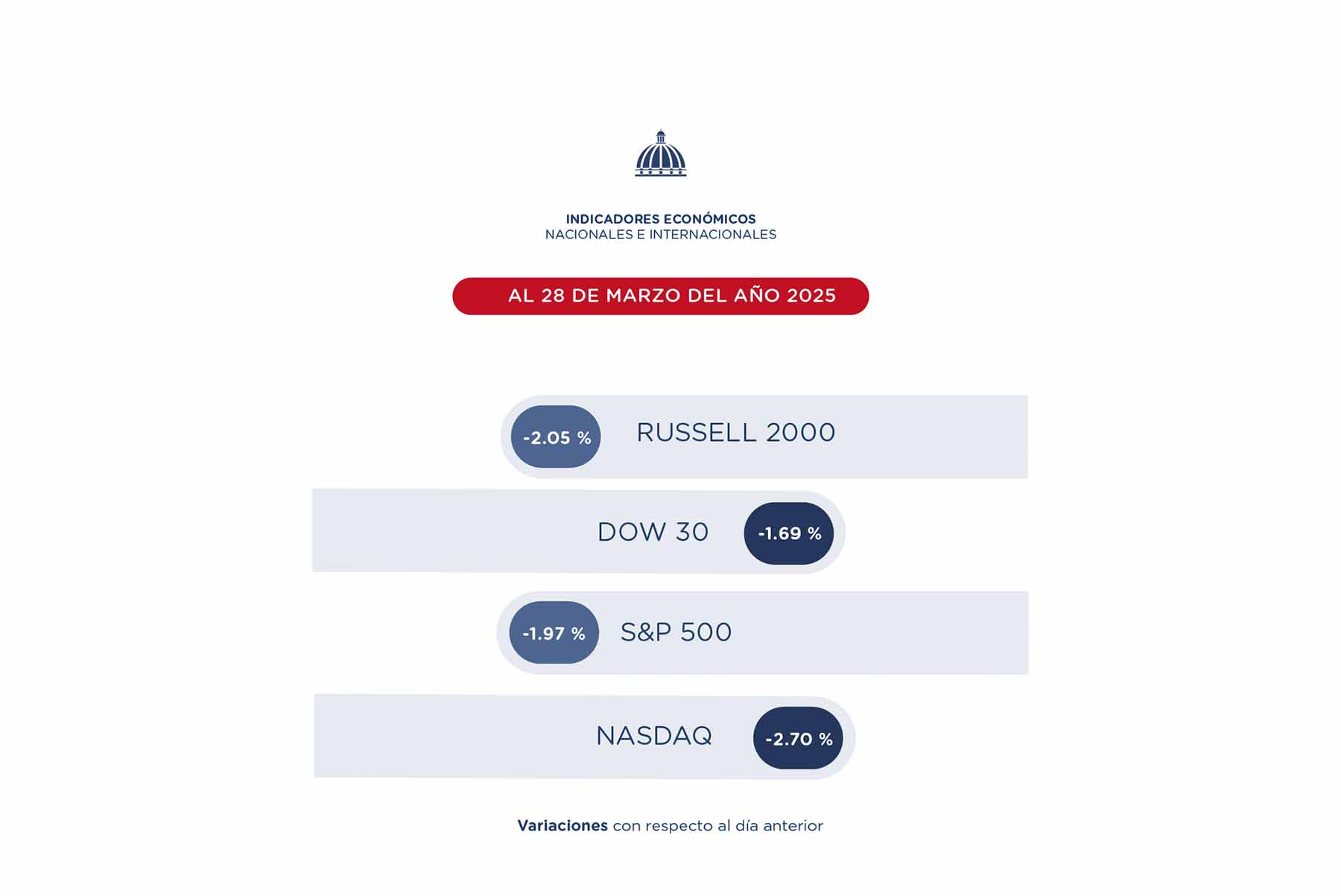 Sostiene que al 28 de marzo, los indicadores de bolsa cerraron con variaciones homogéneas en sus cotizaciones inclinadas a lo negativo, con respecto al día anterior. En ese sentido, detalla que el NASDAQ registró una variación de -2.70 %, el DOW 30 de -1.69 %, el S&P 500 -1.97 % y el RUSSELL 2000 de -2.05 %.