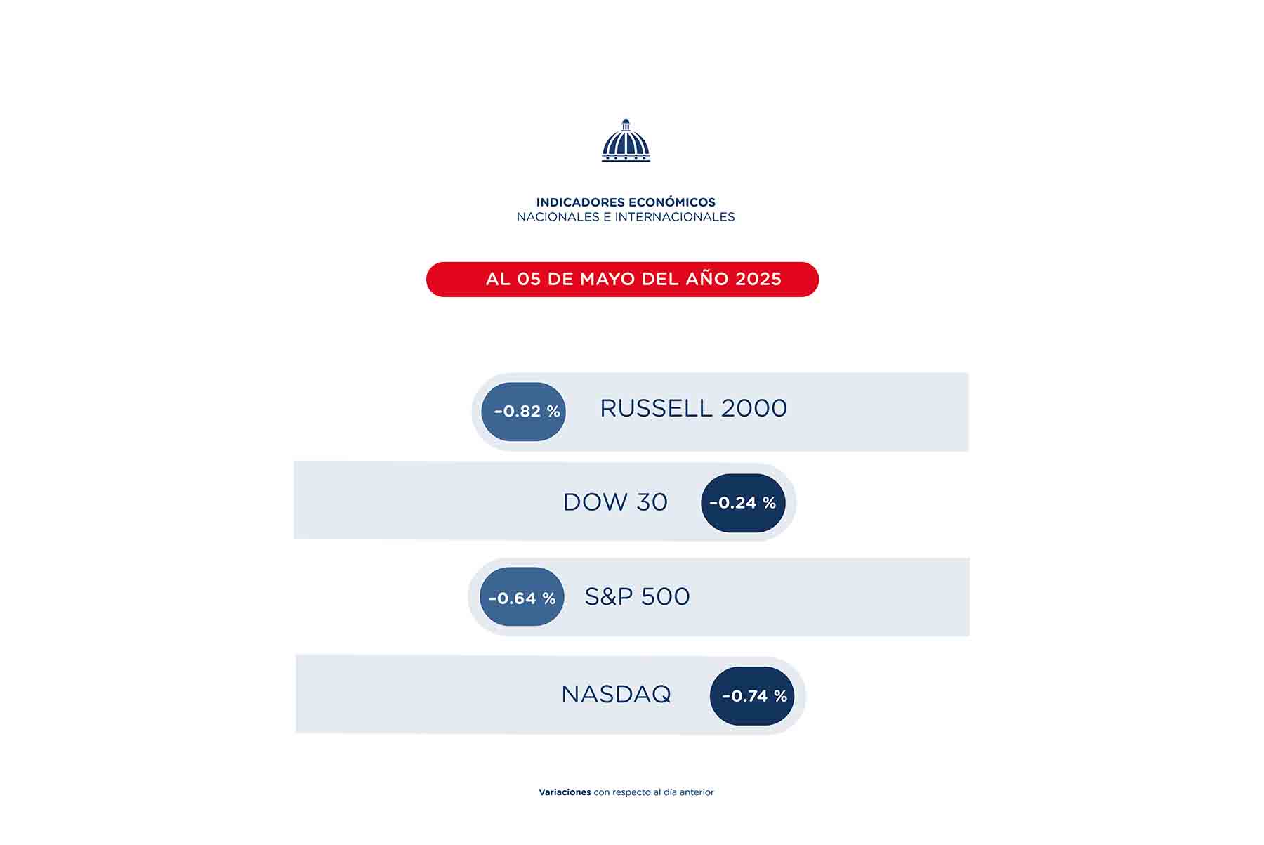 Al 5 de mayo, señala el texto, todos los indicadores de bolsa cerraron con variaciones inclinadas a lo negativo, con respecto al día anterior. Precisa que el NASDAQ se redujo en 0.74 %, el DOW 30 en 0.24 %, el S&P 500 en 0.64 % y el RUSSELL 2000 en 0.82 %.