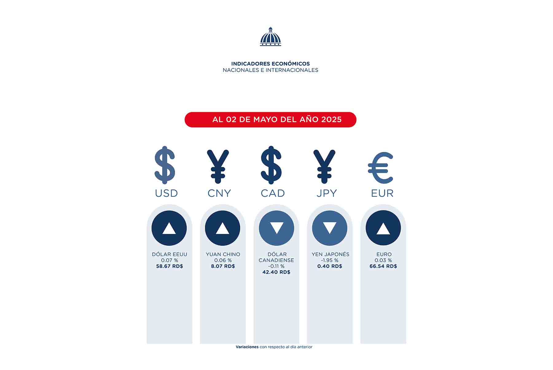 Explica que, al 2 de mayo, se observó que el peso dominicano presentó variaciones heterogéneas con respecto a las principales divisas de referencia en el mercado internacional. La moneda nacional perdió valor con respecto al euro en 0.03 % (66.54 RD$ / EUR), el yuan chino en 0.06 % (8.07 RD$ / CNY) y el dólar estadounidense 0.07 % (58.67 RD$ / USD). Por otra parte, el peso dominicano ganó valor respecto al yen japonés en 1.95 % (0.40 RD$ / JPY) y el dólar canadiense en 0.11 % (42.40 RD$ / CAD).