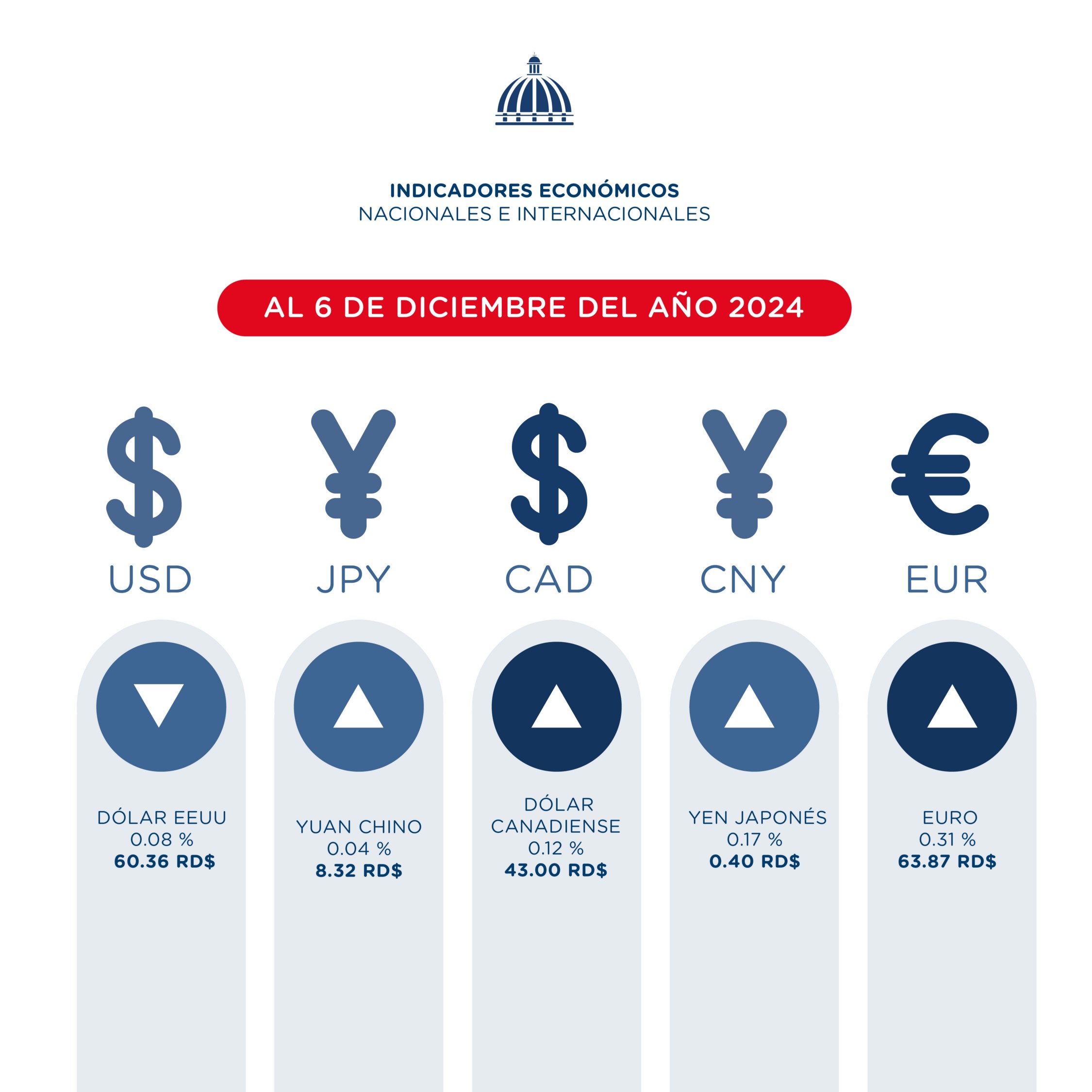 De acuerdo con el resumen, al 06 de diciembre, se observa que las divisas de referencia en el mercado internacional presentaron variaciones heterogéneas con el fortalecimiento del peso dominicano frente a la gran mayoría de las demás divisas, es decir, con respecto al euro se apreció en 0.31 % (63.87 RD$ / EUR), yen japonés en 0.17 % (0.40 RD$ / JPY), el dólar canadiense 0.12 % (43.00 RD$ / CAD) y el yuan chino 0.04 % (RD$ 8.32 / CNY). Con respecto al dólar estadounidense el peso dominicano perdió valor en un 0.08 % (60.36 RD$ / USD).