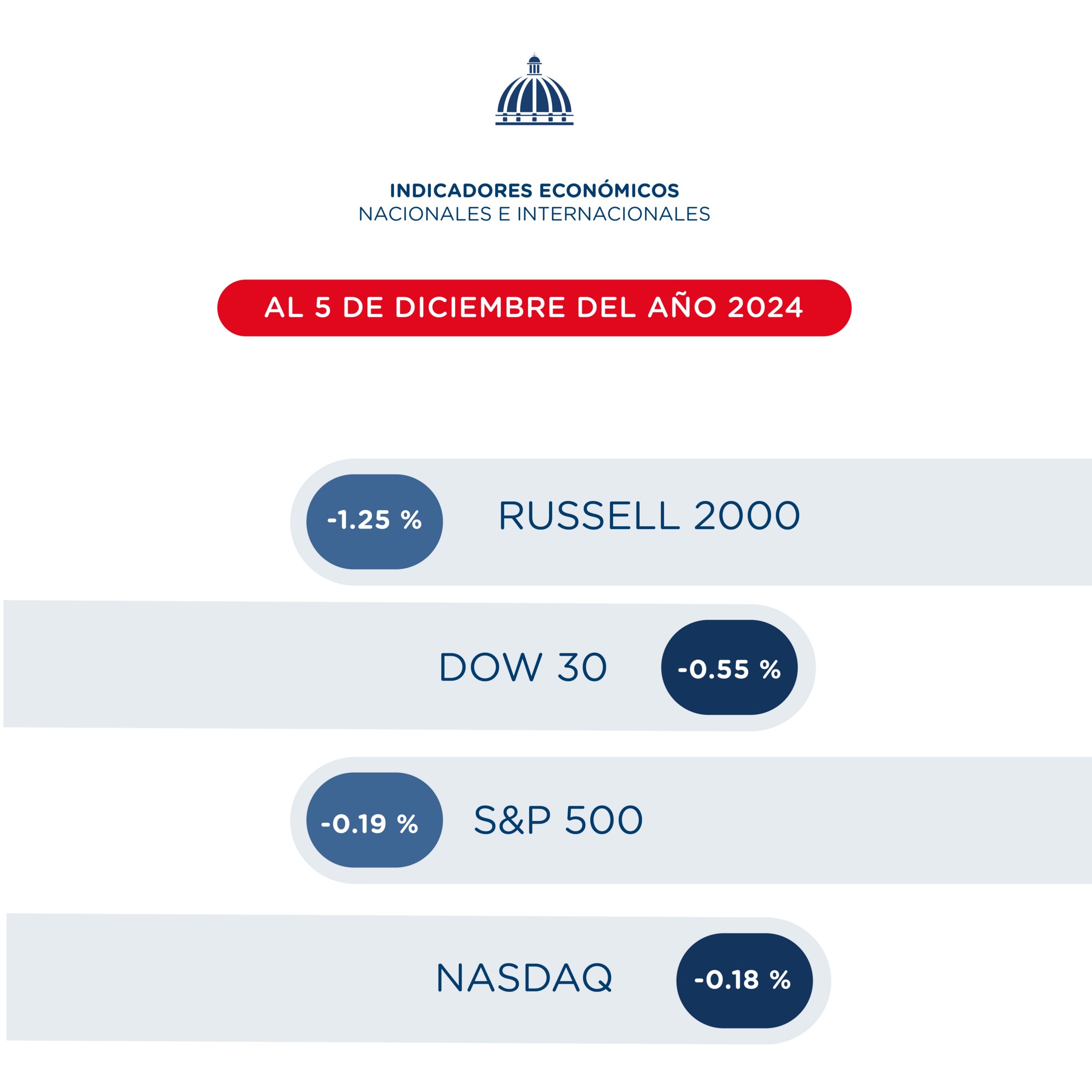 En ese orden, detalla que el RUSSELL 2000 registró una variación de -1.25 %, el DOW 30 de -0.55 %, el S&P 500 de -0.19 % y el NASDAQ de -0.18 %.