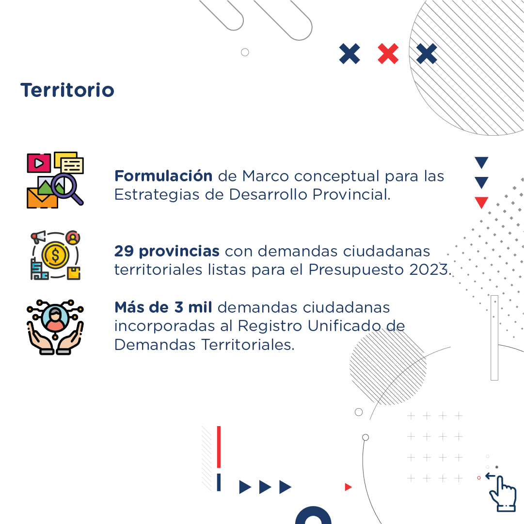 En el aspecto del territorio, fue formulado un marco conceptual para las Estrategias de Desarrollo Provincial y 29 provincias con demandas ciudadanas territoriales listas para el presupuesto 2023.