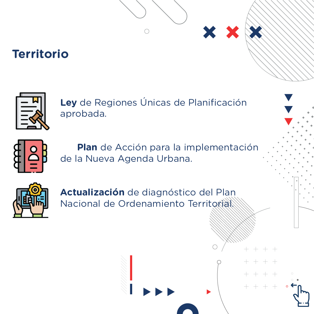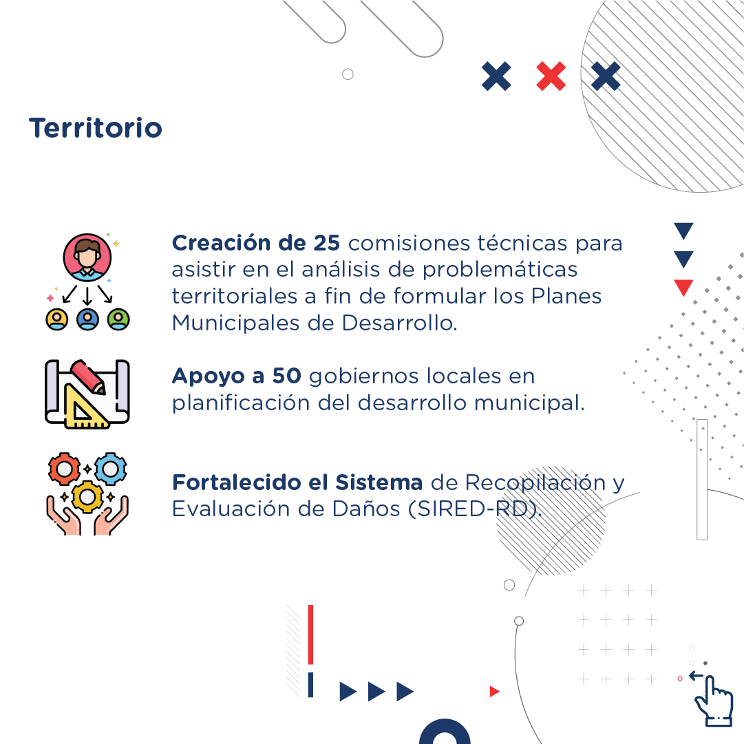 En este ámbito otras acciones fueron la capacitación en ordenamiento territorial a 95 directores y directoras de las Oficinas de Planeamiento Urbano del país, un Plan de Acción para la implementación de la Nueva Agenda Urbana, la actualización de diagnóstico del Plan Nacional de Ordenamiento Territorial, el estudio cartográfico sobre límites territoriales y urbanos de los municipios de la provincia de Santiago.