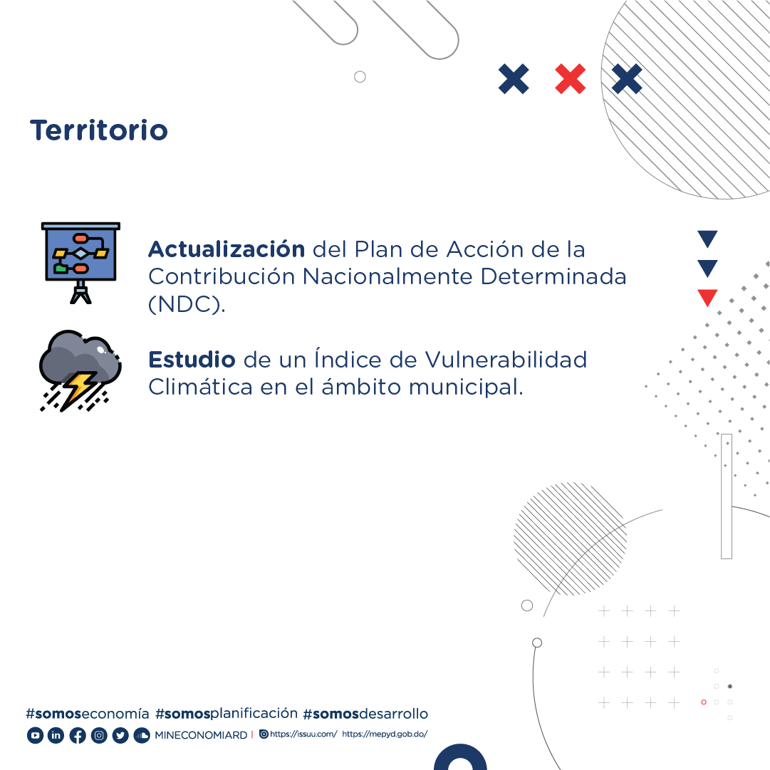 Además, la actualización del Plan de Acción de la Contribución Nacionalmente Determinada (NDC) y Estudio de un Índice de Vulnerabilidad Climática en el ámbito municipal que permite evaluar la resiliencia de los medios de vida, los asentamientos humanos, la agricultura y las actividades económicas.